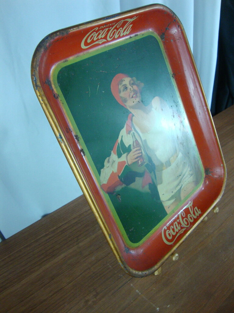 Vintage charming 1930 Drink Coca Cola hostess tray with standing blonde haired woman in white outfit and red scarf relaxing with a Coca Cola in her hand. Tray has wear/tear, finish loss, tarnish, rust, grime per photos and measures 1" height by 13" height by 10 1/2" width. If you choose to arrange to have an item shipped please make sure to insure the shipment as we are not responsible for damage that occurs in shipping. All items are sold “As Is” and all sales are final. Most pieces are one of a kind and can not be replaced. We will give you as much information as possible regarding the pieces condition including supplying additional pictures if needed. Due to the nature of antique and vintage items there may be blemishes, nicks or other imperfections as expected with age and use. If you want more information about an item, such as additional images or condition, please inquire! All items are located in our store at Standpipe Antiques, 502 O Neal Street, Belton, SC, 29627. Our hours are Wednesday through Saturday 10am to 5pm and Sundays 12-5pm. Come by and see us!