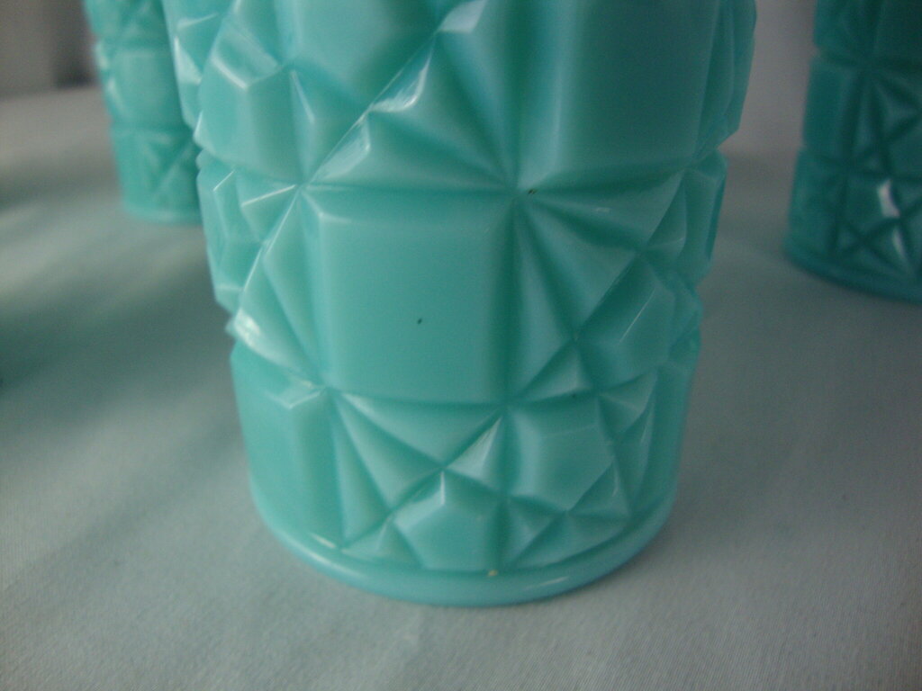 Fabulous 1950s Fenton unmarked turquoise milk glass block and star pattern tall tumblers set of 6 glasses, pattern only made 1955-1957 with tall slender glasses with raised block and star pattern. Glasses have minimal wear/tear and measure 6" height by 3" top diameter. If you choose to arrange to have an item shipped please make sure to insure the shipment as we are not responsible for damage that occurs in shipping. All items are sold “As Is” and all sales are final. Most pieces are one of a kind and can not be replaced. We will give you as much information as possible regarding the pieces condition including supplying additional pictures if needed. Due to the nature of antique and vintage items there may be blemishes, nicks or other imperfections as expected with age and use. If you want more information about an item, such as additional images or condition, please inquire! All items are located in our store at Standpipe Antiques, 502 O Neal Street, Belton, SC, 29627. Our hours are Wednesday through Saturday 10am to 5pm, Sundays 12-5pm. Come by and see us!