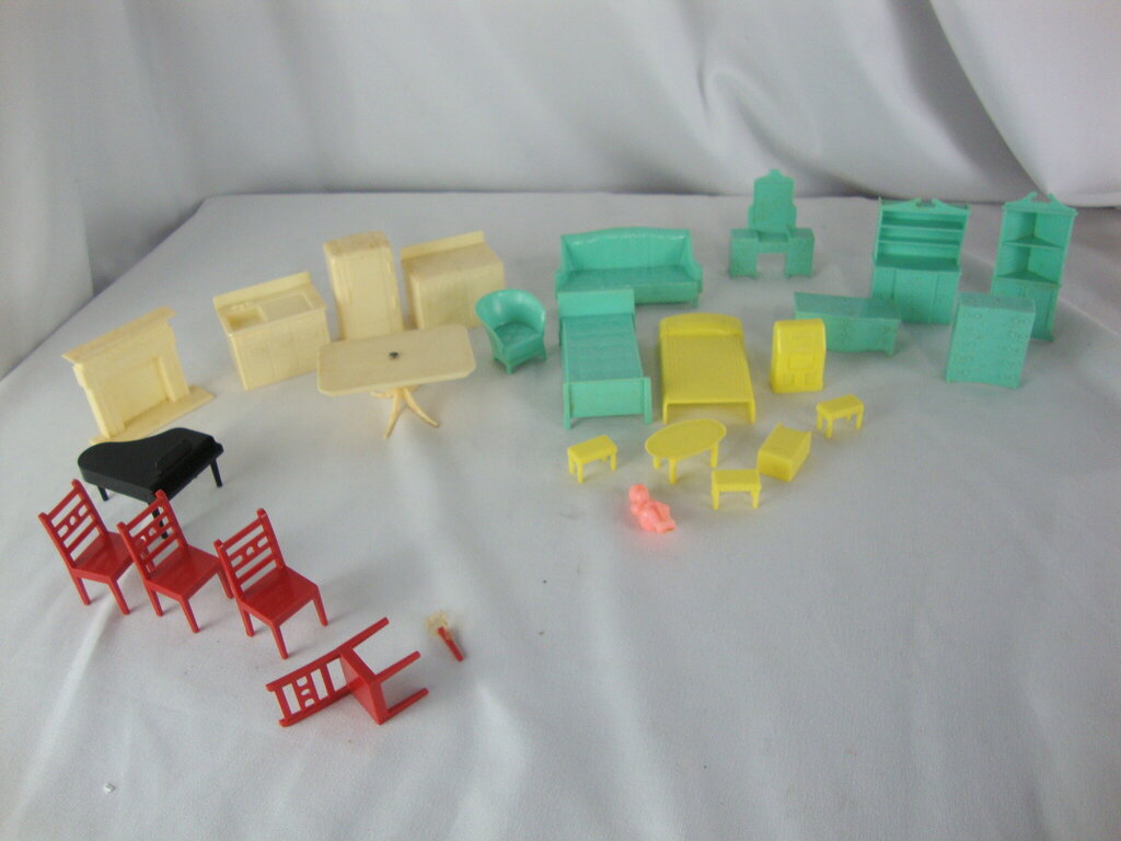 Vintage adorable dollhouse furniture lot from 1950s in fun minty green, yellow, cream kitchen and black piano and red chairs. Lot has wear/tear, red chair has broken leg, stains, finish loss and pieces measure 1/2" - 2" heights 1" to 5" lengths. If you choose to arrange to have an item shipped please make sure to insure the shipment as we are not responsible for damage that occurs in shipping. All items are sold “As Is” and all sales are final. Most pieces are one of a kind and can not be replaced. We will give you as much information as possible regarding the pieces condition including supplying additional pictures if needed. Due to the nature of antique and vintage items there may be blemishes, nicks or other imperfections as expected with age and use. If you want more information about an item, such as additional images or condition, please inquire! All items are located in our store at Standpipe Antiques, 502 O Neal Street, Belton, SC, 29627. Our hours are Wednesday through Saturday 10am to 5pm and Sundays 12-5pm. Come by and see us!