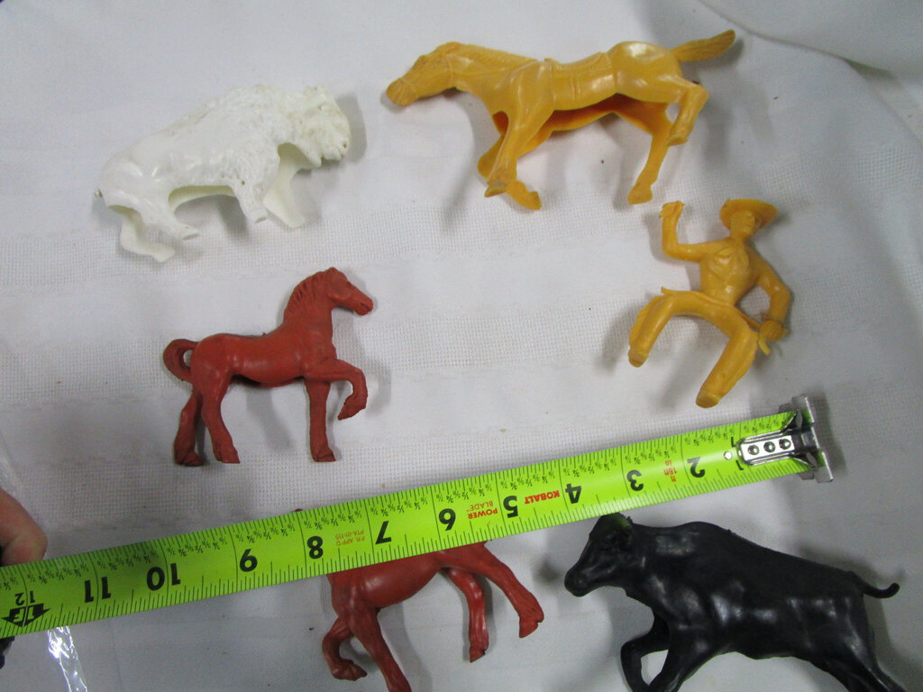 Play like a kid again with this fun 6 piece set of hollow plastic cowboy and farm figures with one yellow plastic cowboy with hat with yellow horse, black bull, two red horses and white bison. Figures have wear/tear/stains and all measure about 2"-3" height by 2"-3" length. If you choose to arrange to have an item shipped please make sure to insure the shipment as we are not responsible for damage that occurs in shipping. All items are sold “As Is” and all sales are final. Most pieces are one of a kind and can not be replaced. We will give you as much information as possible regarding the pieces condition including supplying additional pictures if needed. Due to the nature of antique and vintage items there may be blemishes, nicks or other imperfections as expected with age and use. If you want more information about an item, such as additional images or condition, please inquire! All items are located in our store at Standpipe Antiques, 502 O Neal Street, Belton, SC, 29627. Our hours are Wednesday through Friday 10am to 6pm, Saturday 10am to 5pm and Sundays 12-5pm. Come by and see us!
