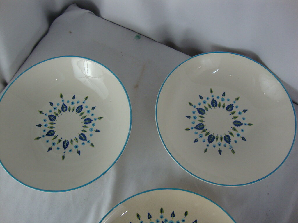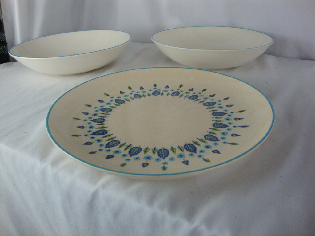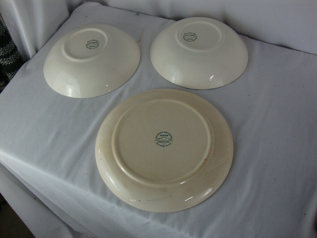 Vintage adorable Stetson Marcrest Swiss Chalet pattern with charming cream with blue/green tree leaf pattern with blue edges. Dishes have wear/tear, crazing, stains, finish loss, dinner plate has allover staining/yellowing, serving bowls are 2" height by 8 3/4" top diameter and plate is 9 3/4" top diameter. If you choose to arrange to have an item shipped please make sure to insure the shipment as we are not responsible for damage that occurs in shipping. All items are sold “As Is” and all sales are final. Most pieces are one of a kind and can not be replaced. We will give you as much information as possible regarding the pieces condition including supplying additional pictures if needed. Due to the nature of antique and vintage items there may be blemishes, nicks or other imperfections as expected with age and use. If you want more information about an item, such as additional images or condition, please inquire! All items are located in our store at Standpipe Antiques, 502 O Neal Street, Belton, SC, 29627. Our hours are Wednesday through Saturday 10am to 5pm and Sundays 12-5pm. Come by and see us!