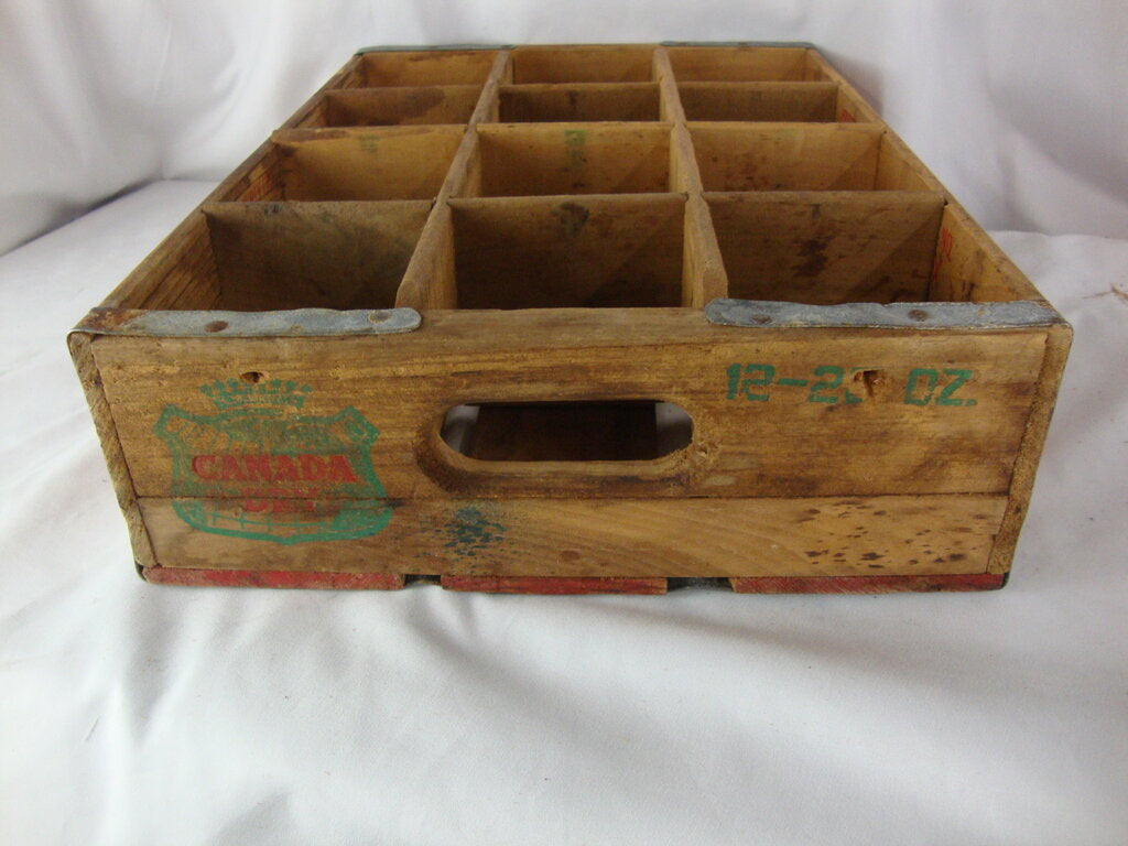 1960s Canada Dry 12 slot wood with metal strapping carry shipping crate with natural wood with red/green text and logo with interior lumber stamp from 1965 Perry Florida Cypress Division. Crate has wear/tear, cracks, stains, finish loss and measures about 4" height by 16 1/2" length by 12" depth. If you choose to arrange to have an item shipped please make sure to insure the shipment as we are not responsible for damage that occurs in shipping. All items are sold “As Is” and all sales are final. Most pieces are one of a kind and can not be replaced. We will give you as much information as possible regarding the pieces condition including supplying additional pictures if needed. Due to the nature of antique and vintage items there may be blemishes, nicks or other imperfections as expected with age and use. If you want more information about an item, such as additional images or condition, please inquire! All items are located in our store at Standpipe Antiques, 502 O Neal Street, Belton, SC, 29627. Our hours are Wednesday through Friday 10am to 6pm, Saturday 10am to 5pm and Sundays 12-5pm so come by and see us!