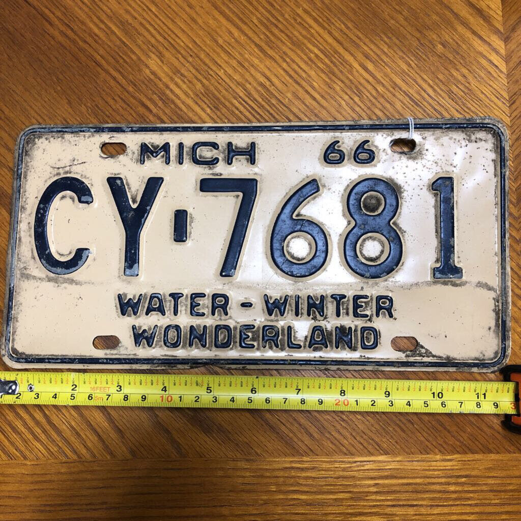 "Own a fun piece of Michigan history with this cool license plate from 1966! Cream body with blue stripe and blue letters/numbers this a fun piece for any wall or vintage car and license plate measures 6"" height by 12"" length. (NOTE: Bent corners/rust/metal missing may exist per photos) If you choose to arrange to have an item shipped please make sure to insure the shipment as we are not responsible for damage that occurs in shipping. All items are sold “As Is� and all sales are final. Most pieces are one of a kind and can not be replaced. We will give you as much information as possible regarding the pieces condition including supplying additional pictures if needed. Due to the nature of antique and vintage items there may be blemishes, nicks or other imperfections as expected with age and use. If you want more information about an item, such as additional images or condition, please inquire! All items are located in our store at Standpipe Antiques, 502 O Neal Street, Belton, SC, 29627. Our hours are Wednesday through Friday 10am to 6pm, Saturday 10-5 and Sundays 12-5pm. Come by and see us!"