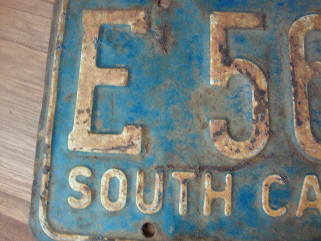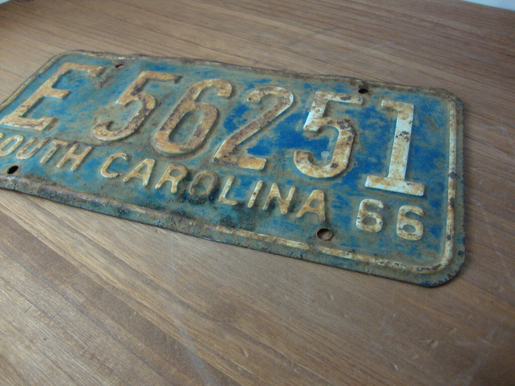"Own a fun piece of South Carolina history with this cool license plate from 1966! Blue body with white stripe with white letters/numbers make this a fun piece for any wall and license plate measures 6"" height by 12"" length. (NOTE: Bent corners/rust/dried paint/metal missing per photos) If you choose to arrange to have an item shipped please make sure to insure the shipment as we are not responsible for damage that occurs in shipping. All items are sold “As Is� and all sales are final. Most pieces are one of a kind and can not be replaced. We will give you as much information as possible regarding the pieces condition including supplying additional pictures if needed. Due to the nature of antique and vintage items there may be blemishes, nicks or other imperfections as expected with age and use. If you want more information about an item, such as additional images or condition, please inquire! All items are located in our store at Standpipe Antiques, 502 O Neal Street, Belton, SC, 29627. Our hours are Wednesday through Friday 10am to 6pm, Saturday 10-5 and Sundays 12-5pm. Come by and see us!"