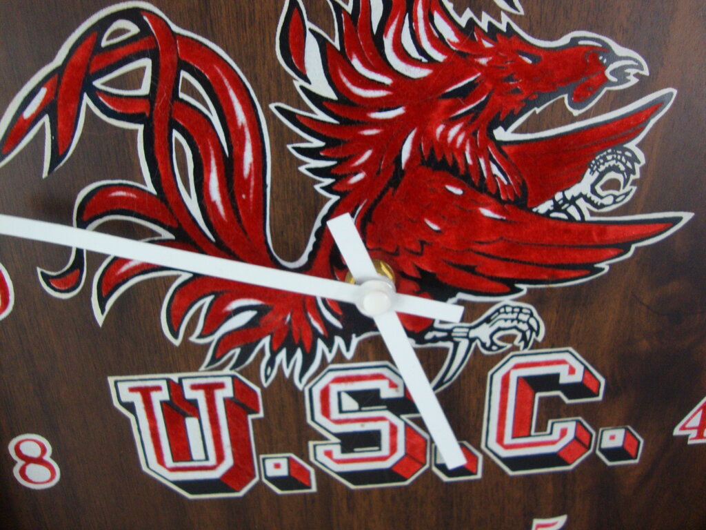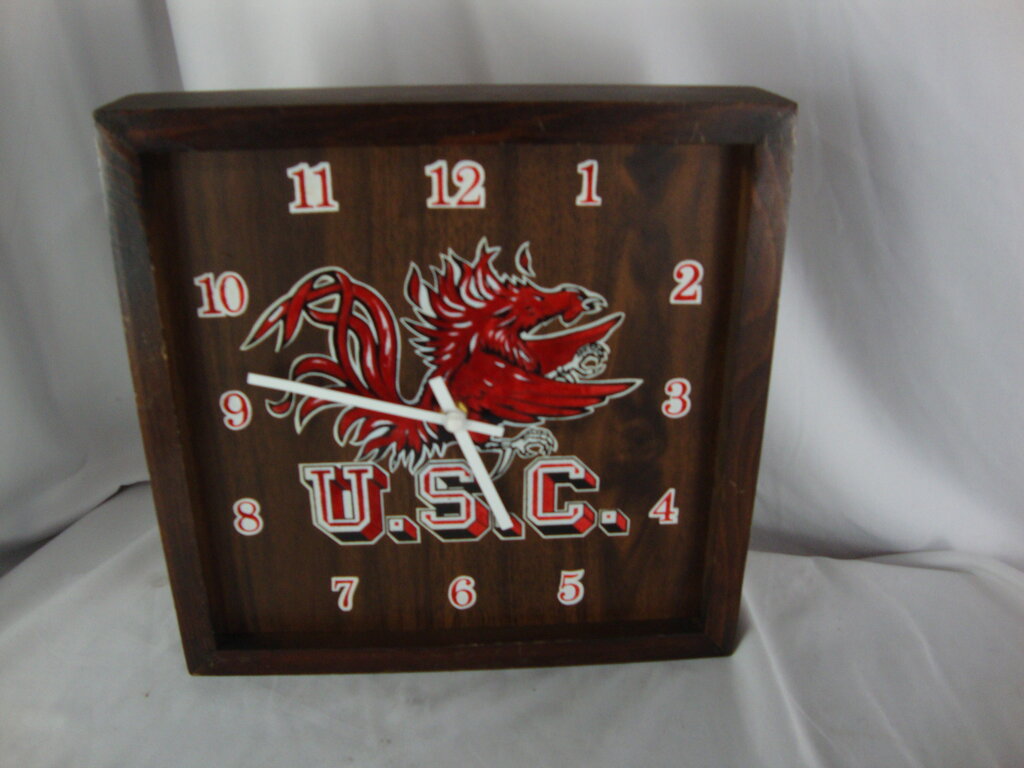 1970's USC Gamecocks dark wood battery wall cock with red white numbers and middle mascot. Clock is untested, has wear/tear, dings, scratches and measures about 12" height by 12" width by 2 1/2" depth. If you choose to arrange to have an item shipped please make sure to insure the shipment as we are not responsible for damage that occurs in shipping. All items are sold “As Is” and all sales are final. Most pieces are one of a kind and can not be replaced. We will give you as much information as possible regarding the pieces condition including supplying additional pictures if needed. Due to the nature of antique and vintage items there may be blemishes, nicks or other imperfections as expected with age and use. If you want more information about an item, such as additional images or condition, please inquire! All items are located in our store at Standpipe Antiques, 502 O Neal Street, Belton, SC, 29627. Our hours are Wednesday through Saturday 10am to 5pm and Sundays 12-5pm so come by and see us!