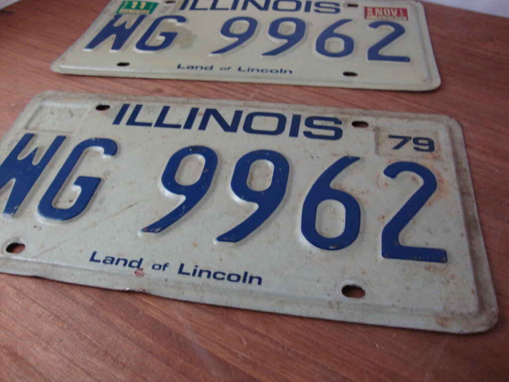 Add to your license collection with this fun matched pair of 1979 Illinois Land of Lincoln license plate car tag WG 9962 with white body, blue wording. Plates measures 6" height by 12" length. (NOTE: Bent corners/rust/dried paint/metal missing may exist per photos) If you choose to arrange to have an item shipped please make sure to insure the shipment as we are not responsible for damage that occurs in shipping. All items are sold “As Is” and all sales are final. Most pieces are one of a kind and can not be replaced. We will give you as much information as possible regarding the pieces condition including supplying additional pictures if needed. Due to the nature of antique and vintage items there may be blemishes, nicks or other imperfections as expected with age and use. If you want more information about an item, such as additional images or condition, please inquire! All items are located in our store at Standpipe Antiques, 502 O Neal Street, Belton, SC, 29627. Our hours are Wednesday through Friday 10am to 6pm, Saturday 10-5 and Sundays 12-5pm. Come by and see us!