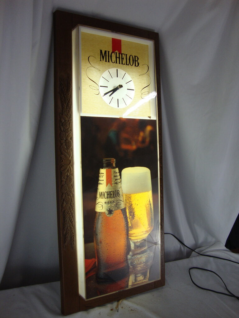 *THIS ITEM IS FOR PICKUP ONLY!* 1970's Michelob Beer lighted bar sign with top electric clock with bottom frosty mug of Michelob beer with faux wood look frame with embossed hops. Sign clock has wear/tear, scratches, finish loss and measures about 33 1/2" height by 13 1/2" width by 5" depth. If you choose to arrange to have an item shipped please make sure to insure the shipment as we are not responsible for damage that occurs in shipping. All items are sold “As Is” and all sales are final. Most pieces are one of a kind and can not be replaced. We will give you as much information as possible regarding the pieces condition including supplying additional pictures if needed. Due to the nature of antique and vintage items there may be blemishes, nicks or other imperfections as expected with age and use. If you want more information about an item, such as additional images or condition, please inquire! All items are located in our store at Standpipe Antiques, 502 O Neal Street, Belton, SC, 29627. Our hours are Wednesday through Saturday 10am to 5pm and Sundays 12-5pm so come by and see us!