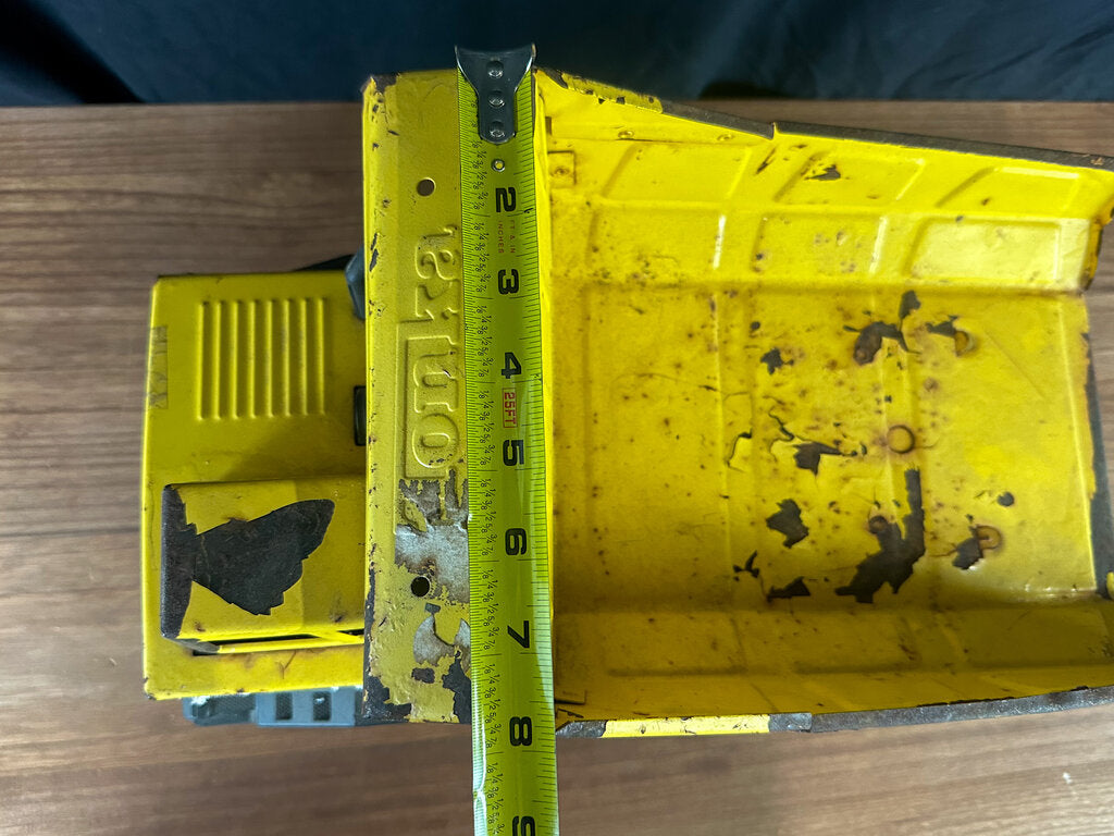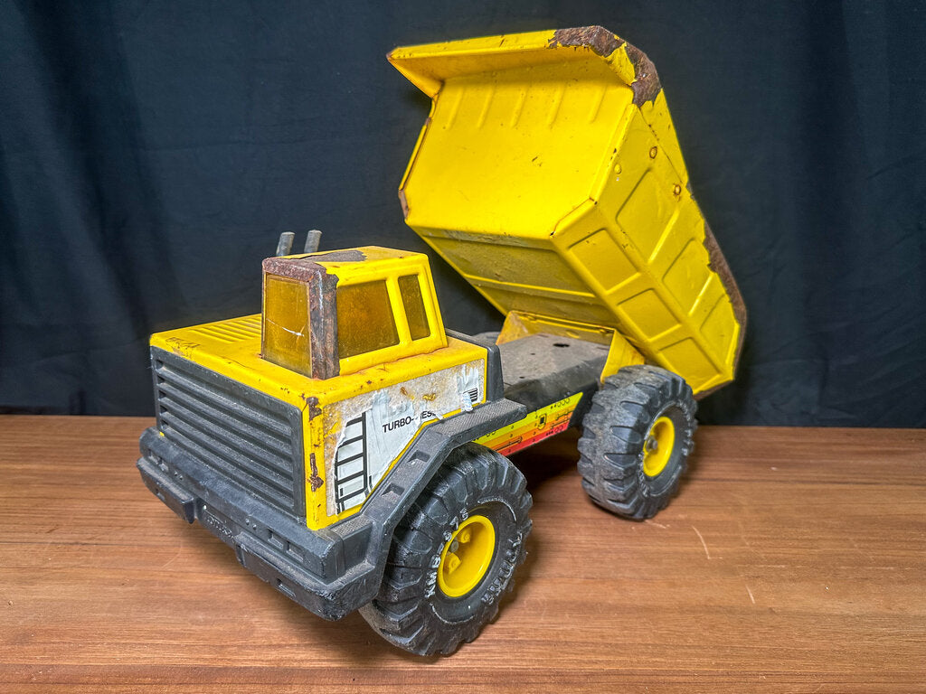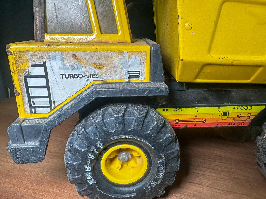 An authentic 1980s metal dump truck toy from 1980s. Well-loved and well-worn. Paint is chipping in some places. Stickers have peeled. The bed is bent some. Wheels still work & the bed still moves.