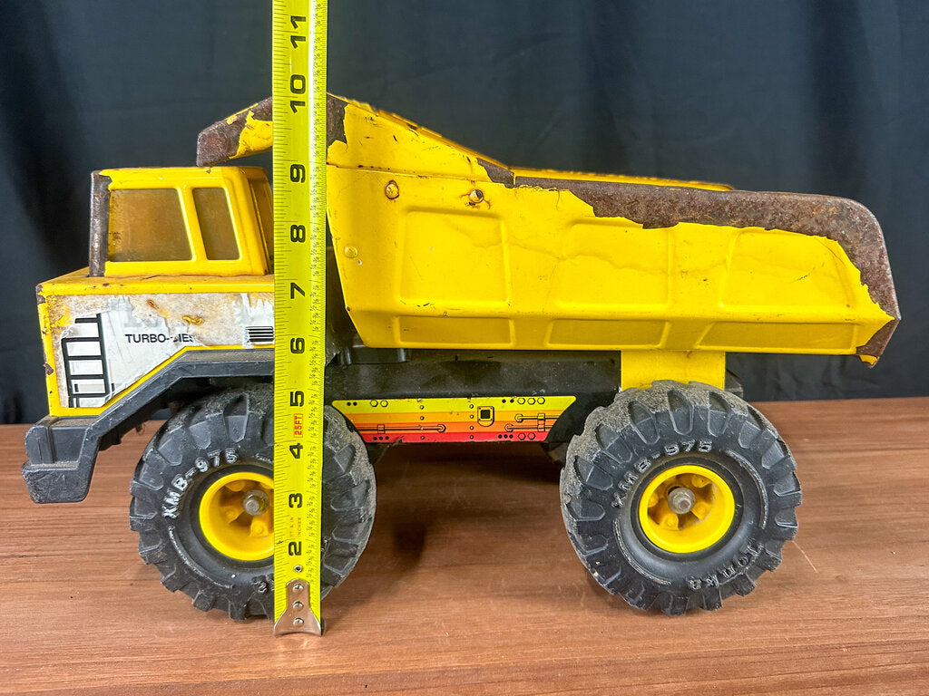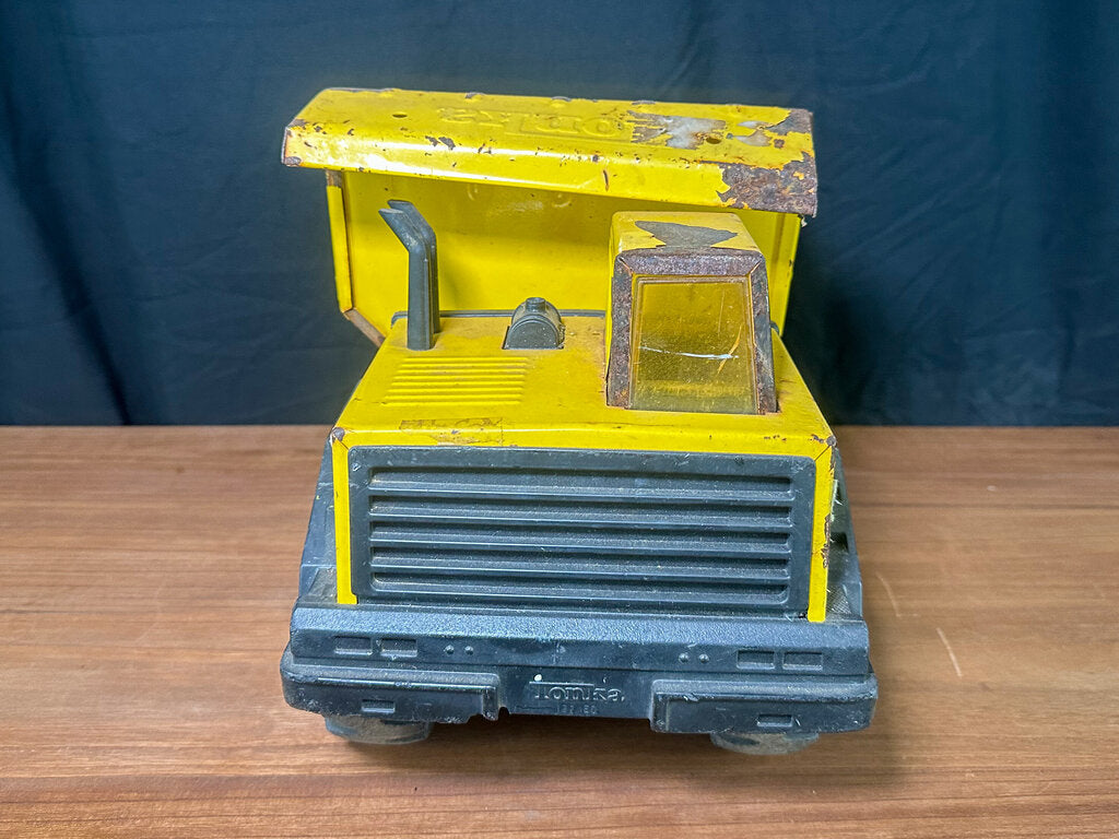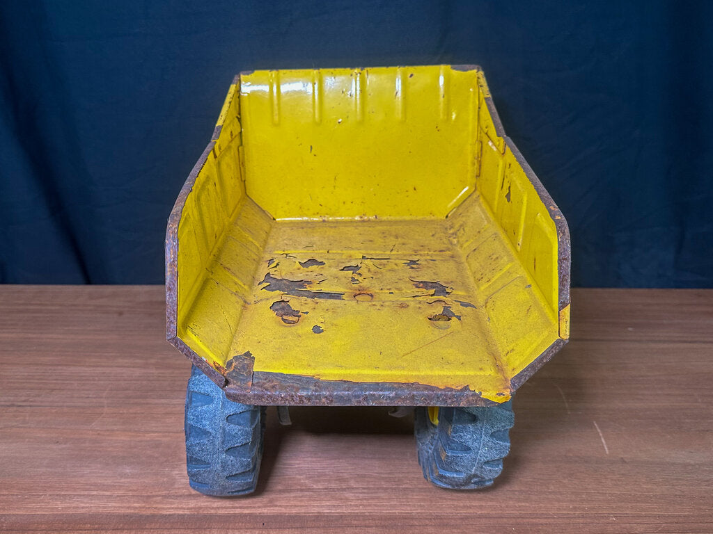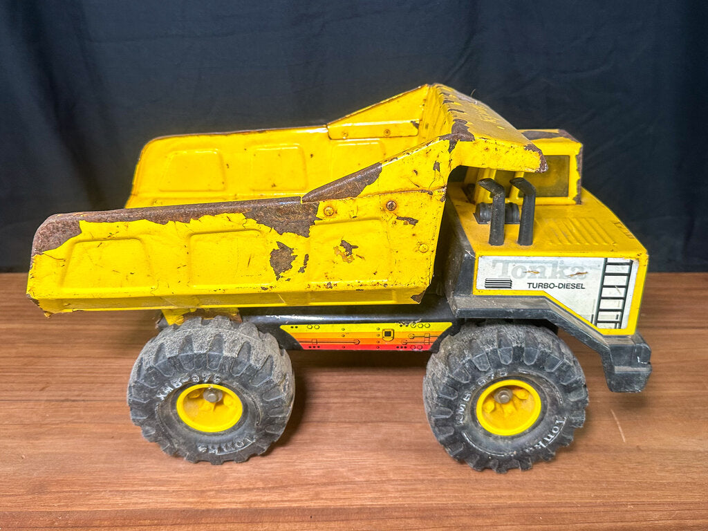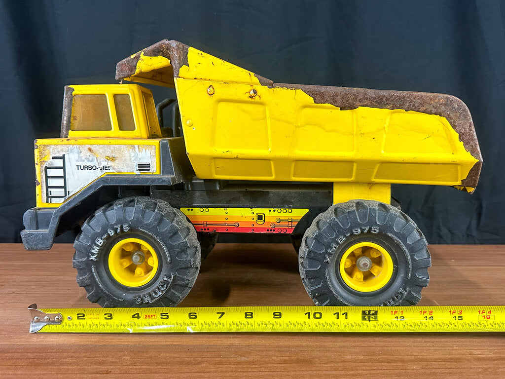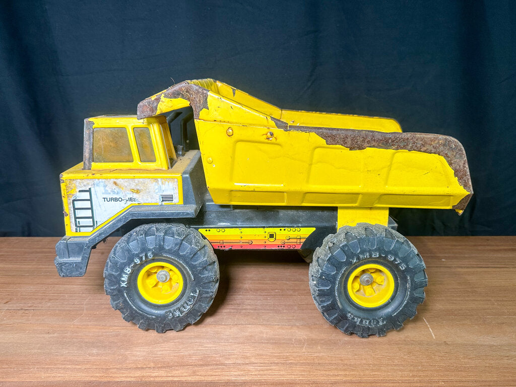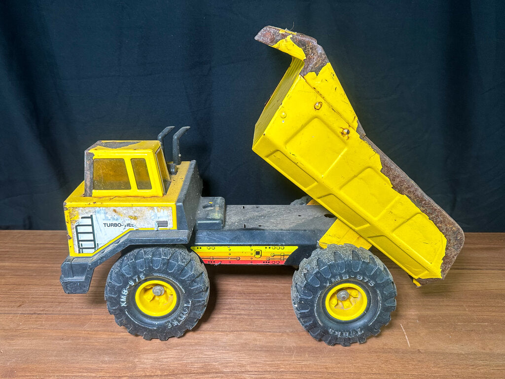 An authentic 1980s metal dump truck toy from 1980s. Well-loved and well-worn. Paint is chipping in some places. Stickers have peeled. The bed is bent some. Wheels still work & the bed still moves.