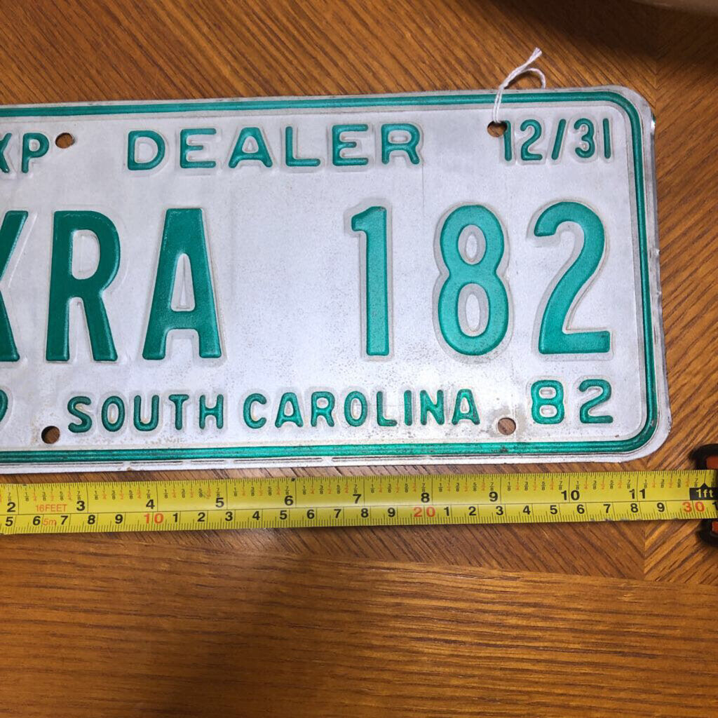 "Own a fun piece of South Carolina history with this cool dealer license plate from 1982! White body with green stripe and green letters/numbers this a fun piece for any wall or vintage car and license plate measures 6"" height by 12"" length. (NOTE: Bent corners/rust/metal missing may exist per photos) If you choose to arrange to have an item shipped please make sure to insure the shipment as we are not responsible for damage that occurs in shipping. All items are sold “As Is� and all sales are final. Most pieces are one of a kind and can not be replaced. We will give you as much information as possible regarding the pieces condition including supplying additional pictures if needed. Due to the nature of antique and vintage items there may be blemishes, nicks or other imperfections as expected with age and use. If you want more information about an item, such as additional images or condition, please inquire! All items are located in our store at Standpipe Antiques, 502 O Neal Street, Belton, SC, 29627. Our hours are Wednesday through Friday 10am to 6pm, Saturday 10-5 and Sundays 12-5pm. Come by and see us!"