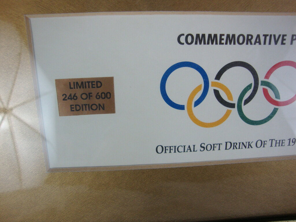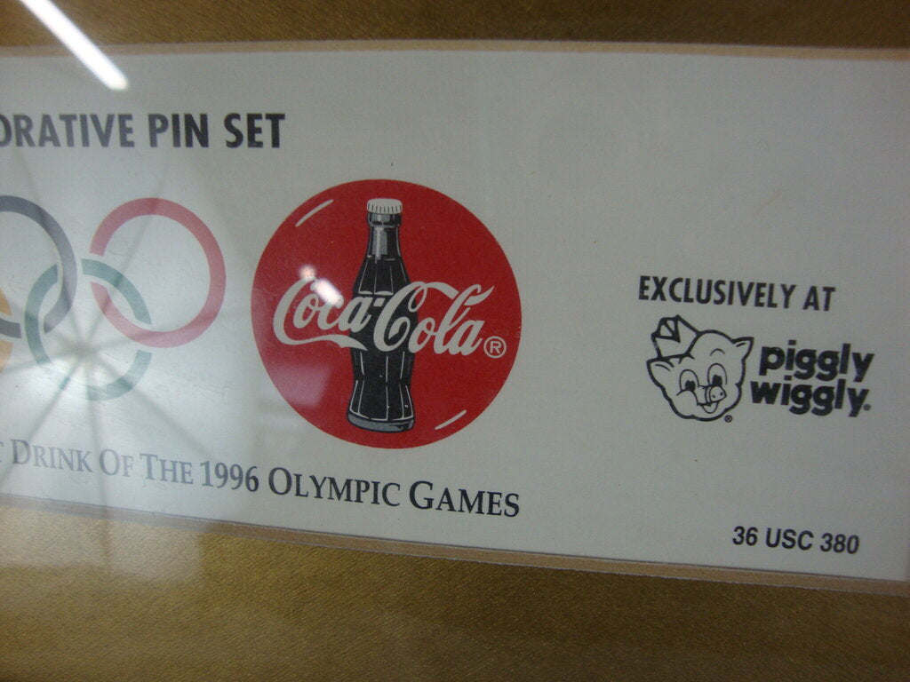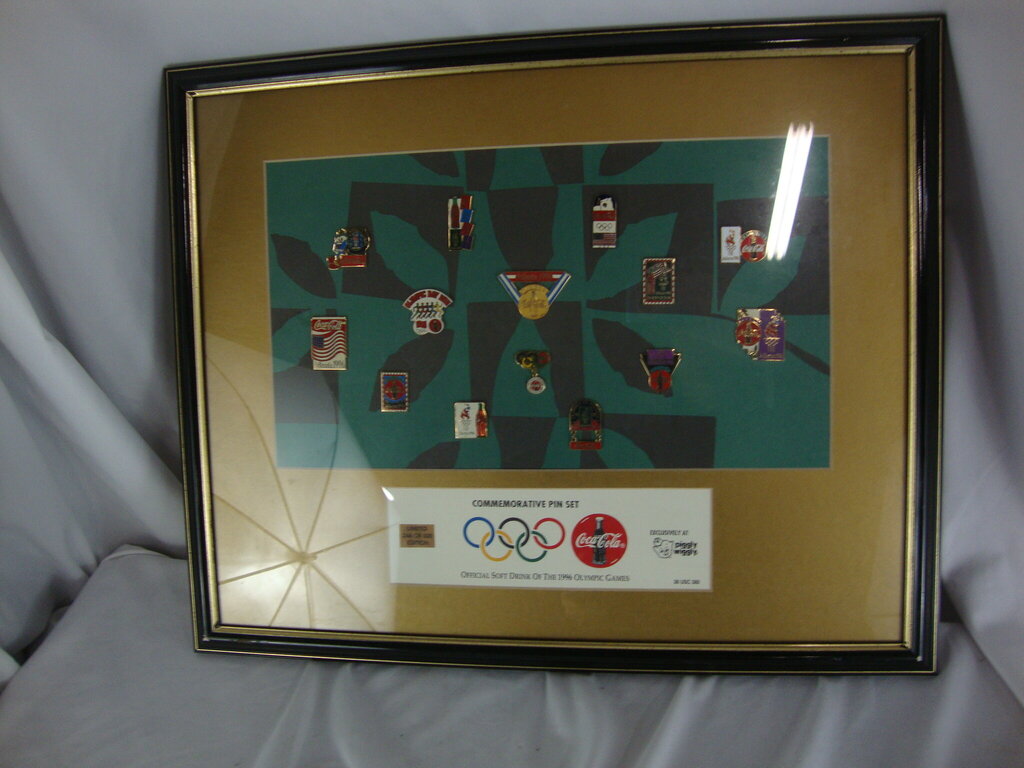 1996 Atlanta Olympics with Coca Cola and Piggly Wiggly limited edition 246/600 commemorative pin set from 1996 Atlanta Olympics with 14 pin set on green backdrop framed with gold mat and black/gold plastic frame. Set has wear/tear, finish loss on frame and frame is 17 1/2" height by 21 1/2" width and pin area is 8 1/2" height by 15" width. If you choose to arrange to have an item shipped please make sure to insure the shipment as we are not responsible for damage that occurs in shipping. All items are sold “As Is” and all sales are final. Most pieces are one of a kind and can not be replaced. We will give you as much information as possible regarding the pieces condition including supplying additional pictures if needed. Due to the nature of antique and vintage items there may be blemishes, nicks or other imperfections as expected with age and use. If you want more information about an item, such as additional images or condition, please inquire! All items are located in our store at Standpipe Antiques, 502 O Neal Street, Belton, SC, 29627. Our hours are Wednesday through Saturday 10am to 5pm, Sundays 12-5pm. Come by and see us!