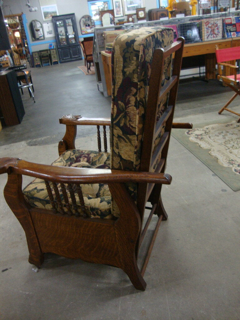 *THIS ITEM IS FOR PICKUP ONLY!* Handsome restored antique Morris style oak recliner with upholstered cushion seat, back and footrest with spindle sides and carved lion head handrests. Chair has wear/tear, veneer missing on chair side bottom per photo and measures about 41" back frame height by 31" depth by 28" outside handrest width by 21" chair pad width by 20" pad depth by 19" cushion height. If you choose to arrange to have an item shipped please make sure to insure the shipment as we are not responsible for damage that occurs in shipping. All items are sold “As Is” and all sales are final. Most pieces are one of a kind and can not be replaced. We will give you as much information as possible regarding the pieces condition including supplying additional pictures if needed. Due to the nature of antique and vintage items there may be blemishes, nicks or other imperfections as expected with age and use. If you want more information about an item, such as additional images or condition, please inquire! All items are located in our store at Standpipe Antiques, 502 O Neal Street, Belton, SC, 29627. Our hours are Wednesday through Saturday 10am to 5pm, Sundays 12-5pm. Come by and see us!