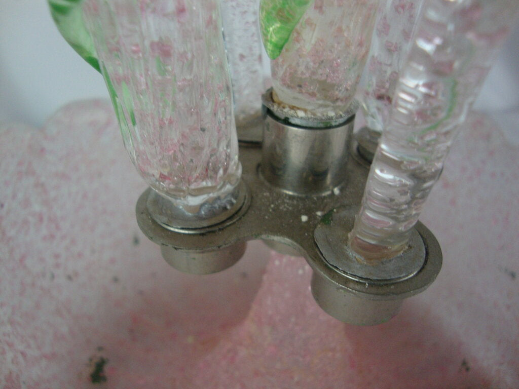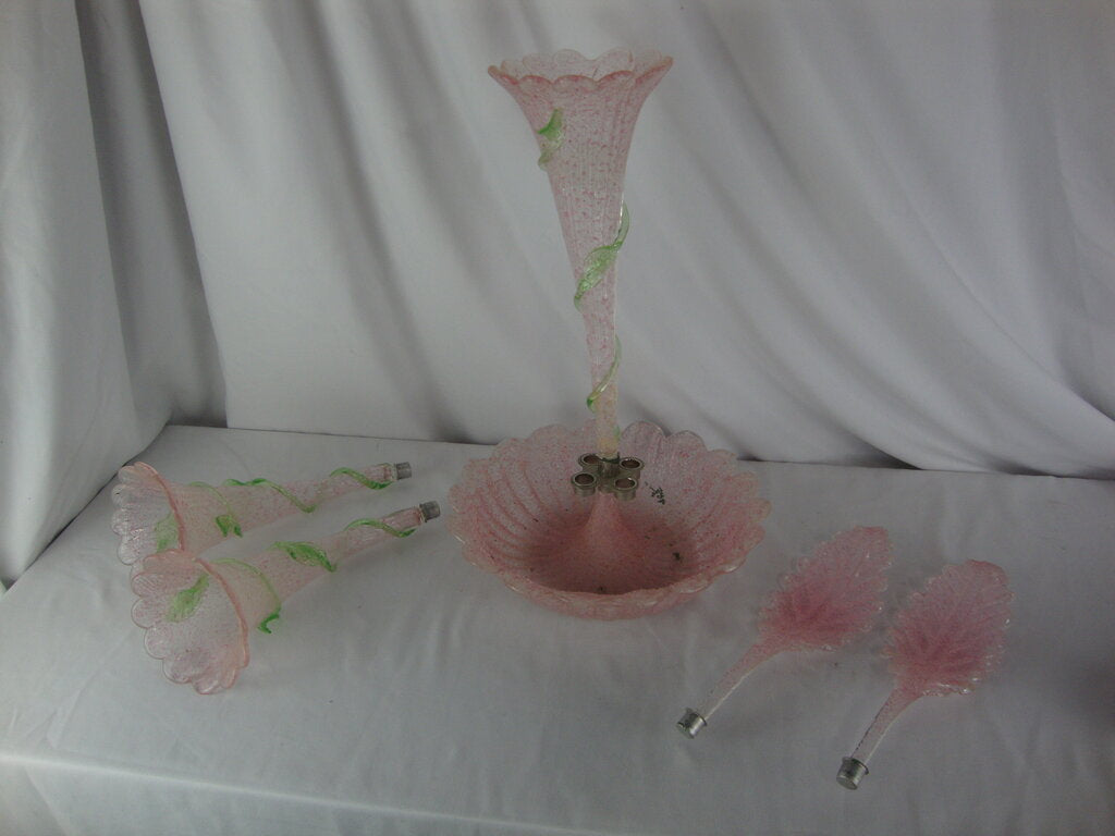Antique Victorian Pink Green Textured Glass Three Horn Epergne Two Leaf Centerpiece Bowl