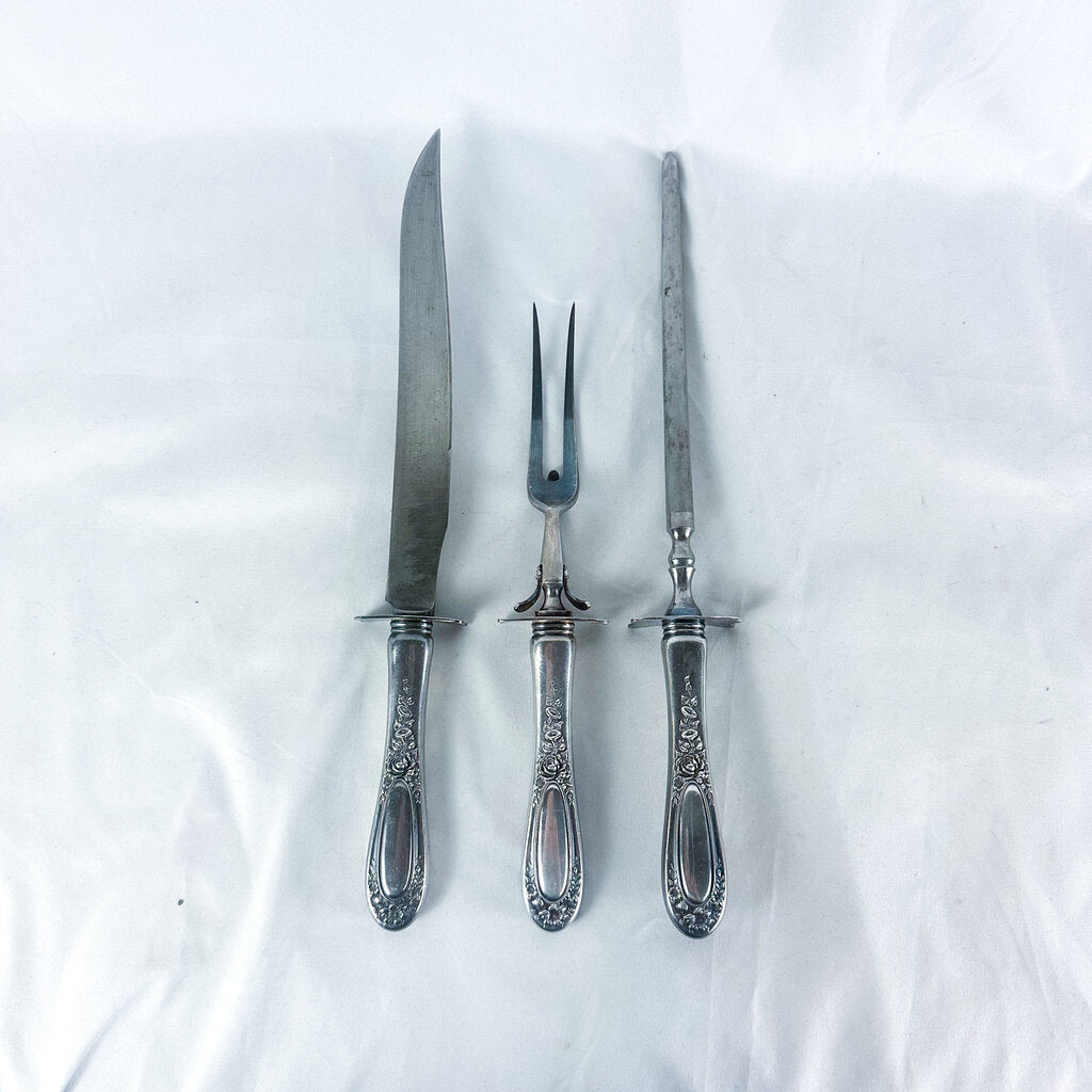 An antique 3-piece silver-plated carving set with a stainless steel blade from Wallace Silver. Knife blade has R-Wallace engraved along with 1835. In our research, we place it at about 1909, but it could be older.
