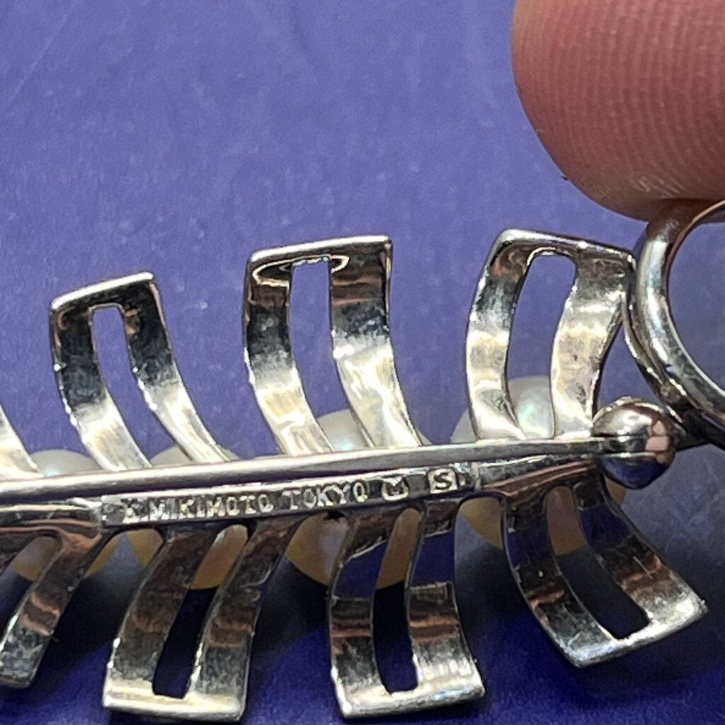 Mikimoto is a well known jewelry brand started in 1893 and the first to culture pearls. They use high quality materials and craftsmanship to create stunning pieces. This brooch and earring set is an example of such work. This sterling silver leaf and abstract flower pattern shows off the beautiful Akoya pearls with elegance.