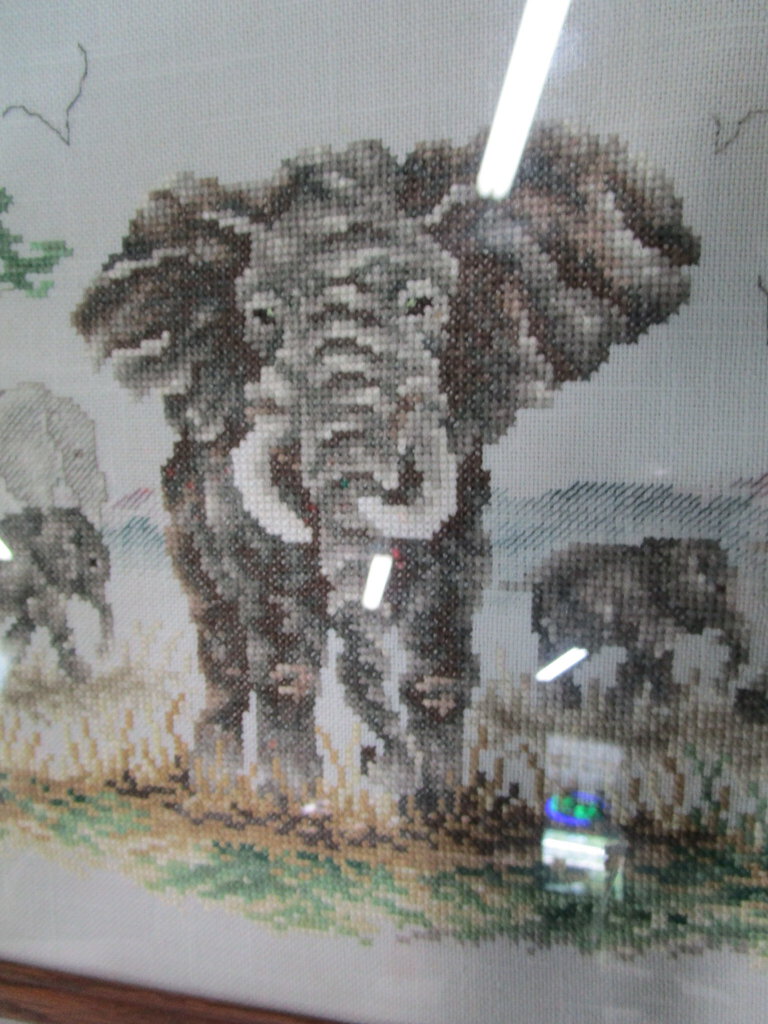 Show your love for elephants with this charming hand stitched African elephant family with middle large elephant with tusks and side view of smaller elephants with birds above and green tree in corner. Framed in wood with glass front the frame is 18" length by 11" height. If you choose to arrange to have an item shipped please make sure to insure the shipment as we are not responsible for damage that occurs in shipping. All items are sold “As Is” and all sales are final. Most pieces are one of a kind and can not be replaced. We will give you as much information as possible regarding the pieces condition including supplying additional pictures if needed. Due to the nature of antique and vintage items there may be blemishes, nicks or other imperfections as expected with age and use. If you want more information about an item, such as additional images or condition, please inquire! All items are located in our store at Standpipe Antiques, 502 O Neal Street, Belton, SC, 29627. Our hours are Wednesday through Friday 10am to 6pm, Saturday 10am to 5pm and Sundays 12-5pm. Come by and see us!