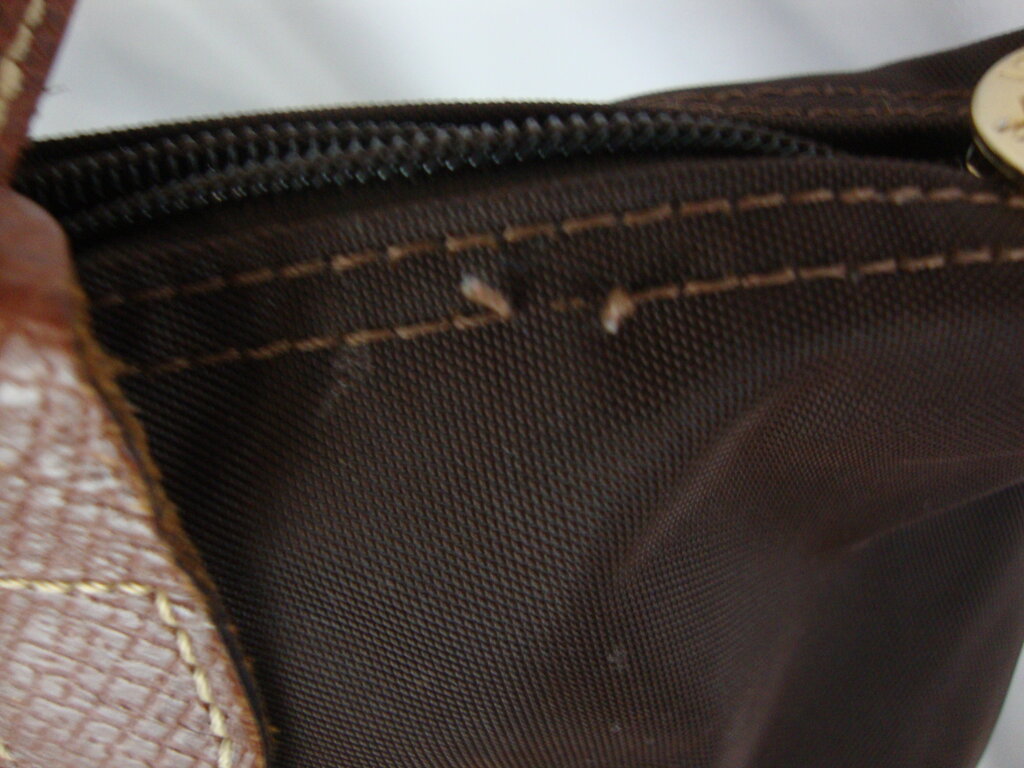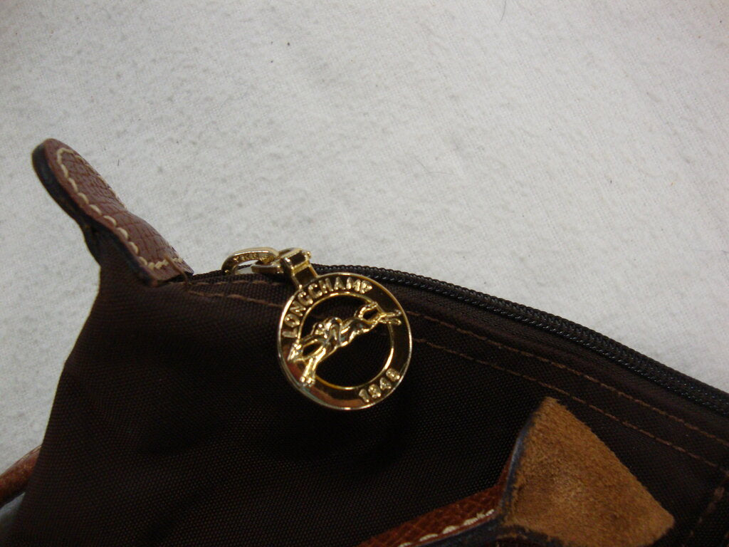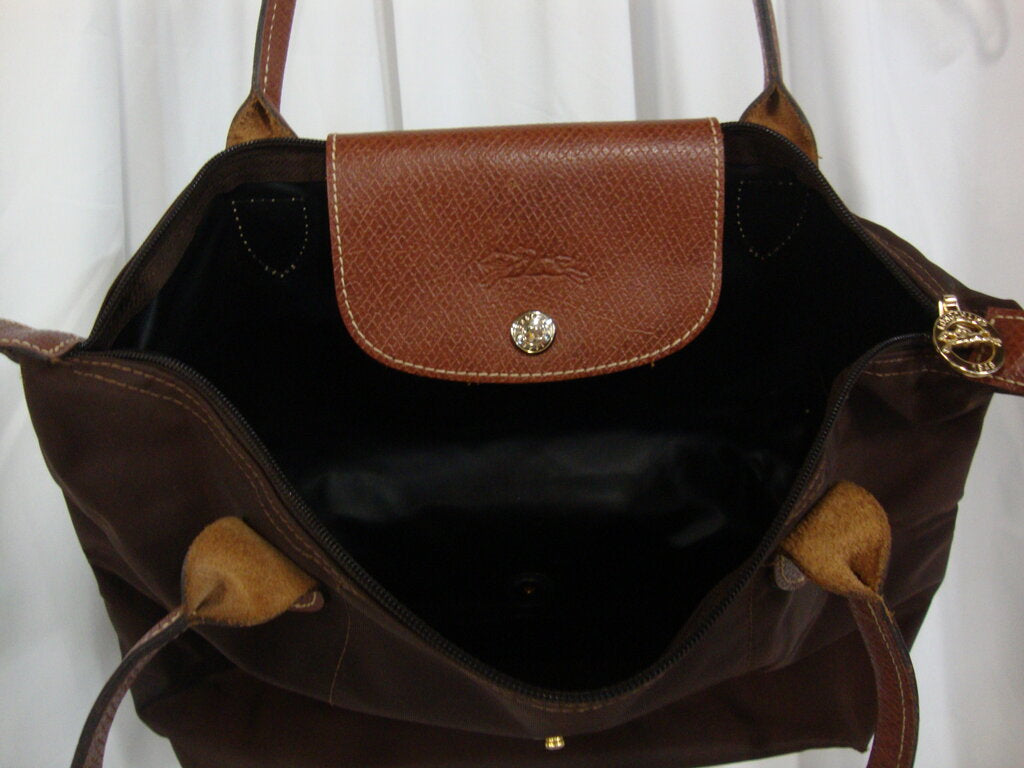 Longchamp Paris France dark brown canvas body shoulder bag purse with medium brown leather straps and snap flap. Purse has wear/tear, loose/missing threads at top edge, wear at bottom edges and bottom stains per photos and measures about 18" total height by 8" strap height by 13 1/2" purse body width by 4 1/2" bottom purse depth. If you choose to arrange to have an item shipped please make sure to insure the shipment as we are not responsible for damage that occurs in shipping. All items are sold “As Is” and all sales are final. Most pieces are one of a kind and can not be replaced. We will give you as much information as possible regarding the pieces condition including supplying additional pictures if needed. Due to the nature of antique and vintage items there may be blemishes, nicks or other imperfections as expected with age and use. If you want more information about an item, such as additional images or condition, please inquire! All items are located in our store at Standpipe Antiques, 502 O Neal Street, Belton, SC, 29627. Our hours are Wednesday through Saturday 10am to 5pm and Sundays 12-5pm. Come by and see us!