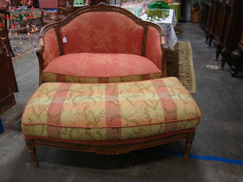 *THIS ITEM IS FOR PICKUP ONLY!* Lovely oversized chair and a half peach yellow leafy fabric chair with matching full length ottoman with carved wood frames with flower motif great for lounging! Chair and ottoman have wear/tear, few surface stains, dings and chair is 39" back height by 45" length by 24" middle cushion depth by 18 1/2" seat height by ottoman 46" length by 22" depth. If you choose to arrange to have an item shipped please make sure to insure the shipment as we are not responsible for damage that occurs in shipping. All items are sold “As Is” and all sales are final. Most pieces are one of a kind and can not be replaced. We will give you as much information as possible regarding the pieces condition including supplying additional pictures if needed. Due to the nature of antique and vintage items there may be blemishes, nicks or other imperfections as expected with age and use. If you want more information about an item, such as additional images or condition, please inquire! All items are located in our store at Standpipe Antiques, 502 O Neal Street, Belton, SC, 29627. Our hours are Wednesday through Saturday 10am to 5pm and Sundays 12-5pm. Come by and see us!