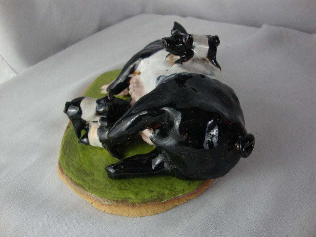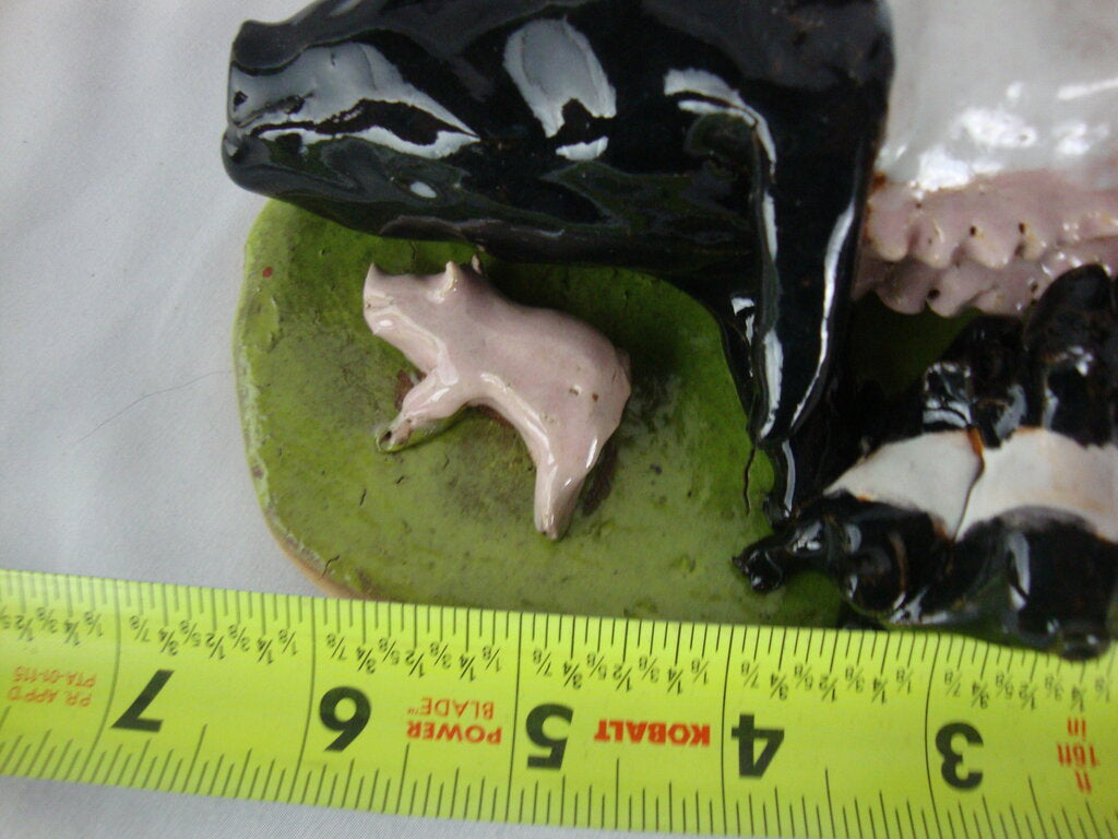 Folk art adorable Lynn Bailey SC pottery table figurine with black white large mama pig with multiple black white and one pink piglet climbing on her laying on a patch of bright green grass. Figure is handmade and measures about 1" to 3" figure heights by 6" by 4" base. If you choose to arrange to have an item shipped please make sure to insure the shipment as we are not responsible for damage that occurs in shipping. All items are sold “As Is” and all sales are final. Most pieces are one of a kind and can not be replaced. We will give you as much information as possible regarding the pieces condition including supplying additional pictures if needed. Due to the nature of antique and vintage items there may be blemishes, nicks or other imperfections as expected with age and use. If you want more information about an item, such as additional images or condition, please inquire! All items are located in our store at Standpipe Antiques, 502 O Neal Street, Belton, SC, 29627. Our hours are Wednesday through Saturday 10am to 5pm and Sundays 12-5pm. Come by and see us!
