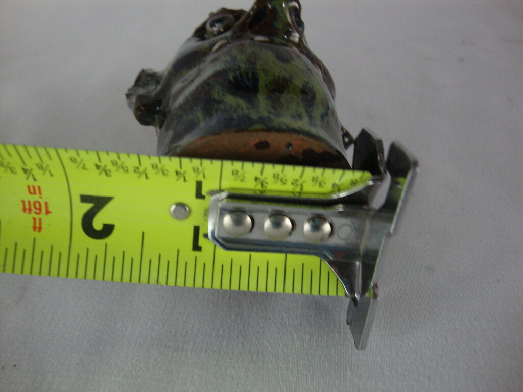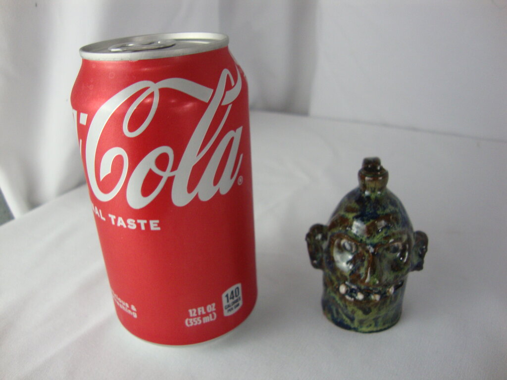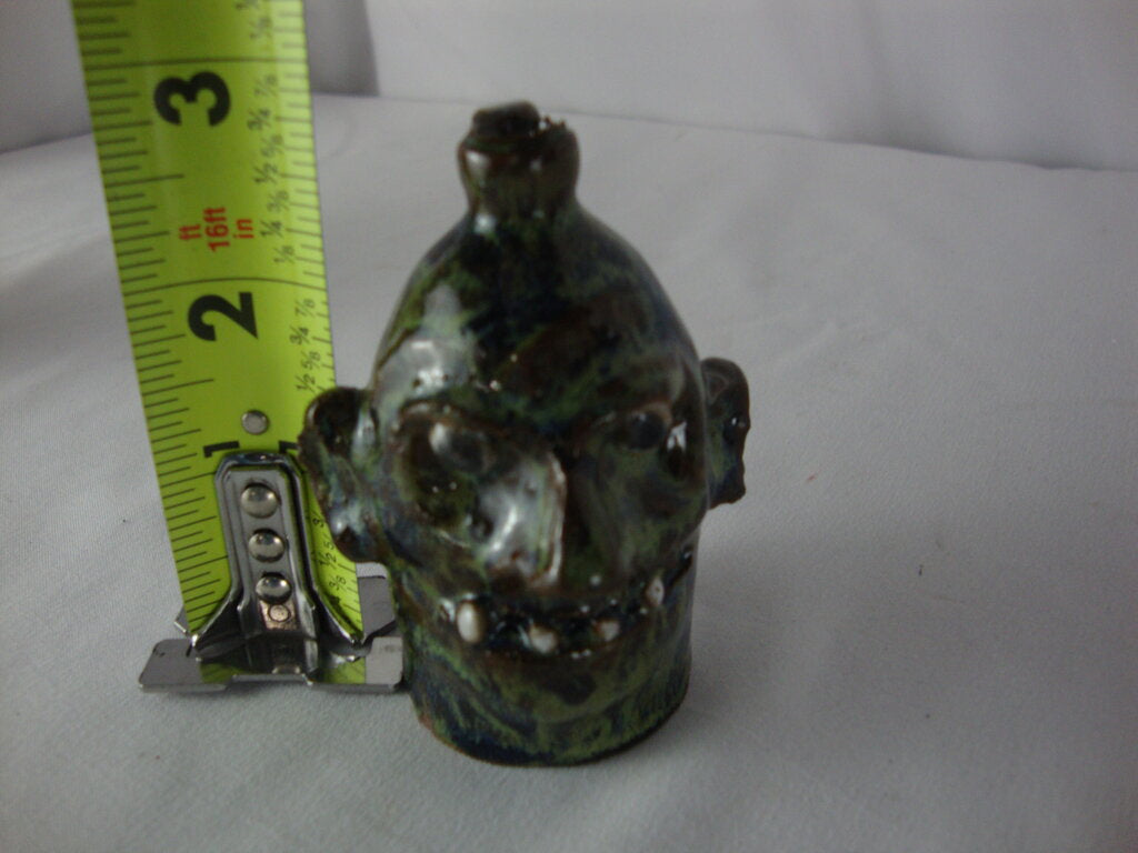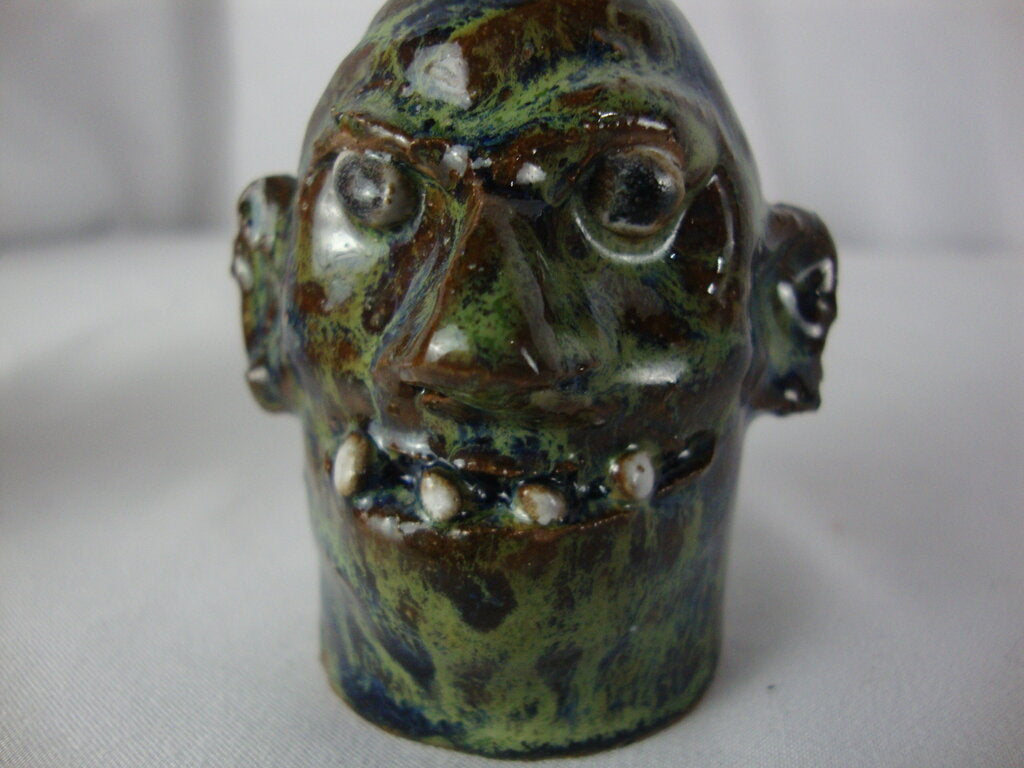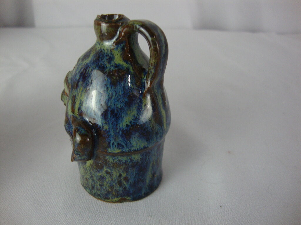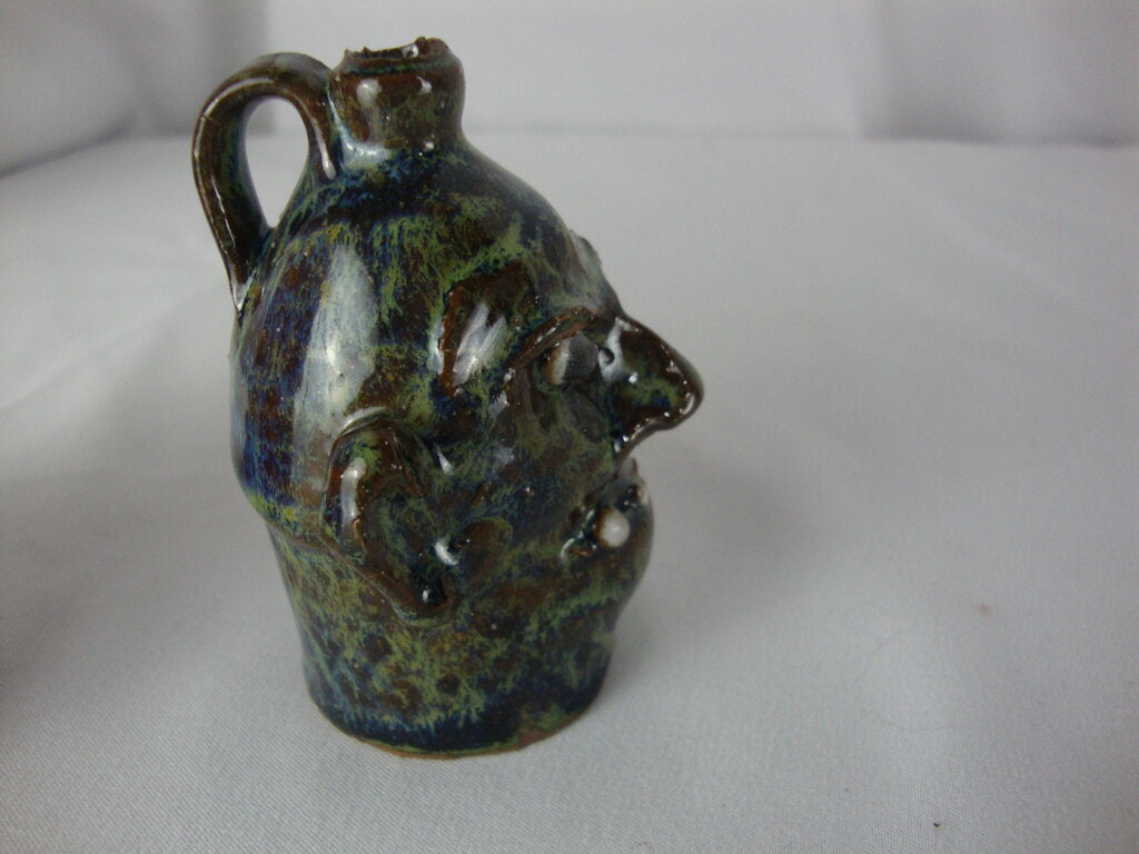 Marvin Bailey SC potter modern mini to the max ugly face jug done in green blue brown finish with four spaced out teeth with bulbous nose, round black beady eyes and large ears. Jug has wear/tear, defects, jug measures 1" bottom diameter by 3" spout height. If you choose to arrange to have an item shipped please make sure to insure the shipment as we are not responsible for damage that occurs in shipping. All items are sold “As Is” and all sales are final. Most pieces are one of a kind and can not be replaced. We will give you as much information as possible regarding the pieces condition including supplying additional pictures if needed. Due to the nature of antique and vintage items there may be blemishes, nicks or other imperfections as expected with age and use. If you want more information about an item, such as additional images or condition, please inquire! All items are located in our store at Standpipe Antiques, 502 O Neal Street, Belton, SC, 29627. Our hours are Wednesday through Friday 10am to 6pm, Saturday 10am to 5pm and Sundays 12-5pm. Come by and see us!