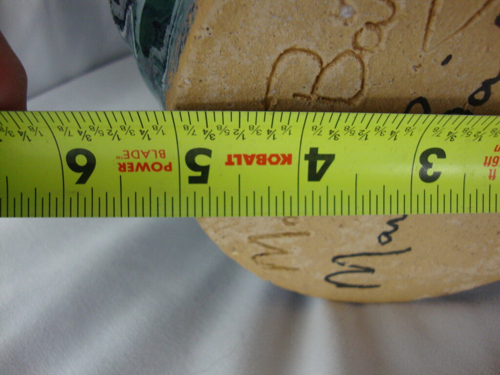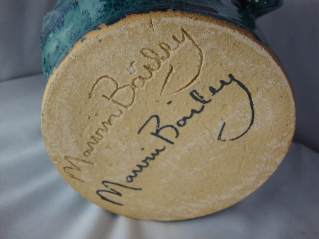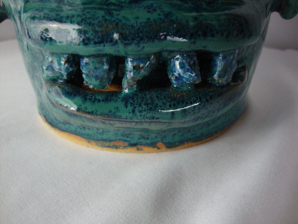 Marvin Bailey SC potter modern ugly face jug in super cool aqua blue speckly finish with back top spout, center top handle, blue beady eyes with small nose and large ridged open mouth with 5 tonal colored teeth with large side ears. Jug has minimal wear/tear, production flaws and measures about 5" bottom diameter by 9" handle height by about 7" ear to ear width. If you choose to arrange to have an item shipped please make sure to insure the shipment as we are not responsible for damage that occurs in shipping. All items are sold “As Is” and all sales are final. Most pieces are one of a kind and can not be replaced. We will give you as much information as possible regarding the pieces condition including supplying additional pictures if needed. Due to the nature of antique and vintage items there may be blemishes, nicks or other imperfections as expected with age and use. If you want more information about an item, such as additional images or condition, please inquire! All items are located in our store at Standpipe Antiques, 502 O Neal Street, Belton, SC, 29627. Our hours are Wednesday through Saturday 10am to 5pm and Sundays 12-5pm so come by and see us!