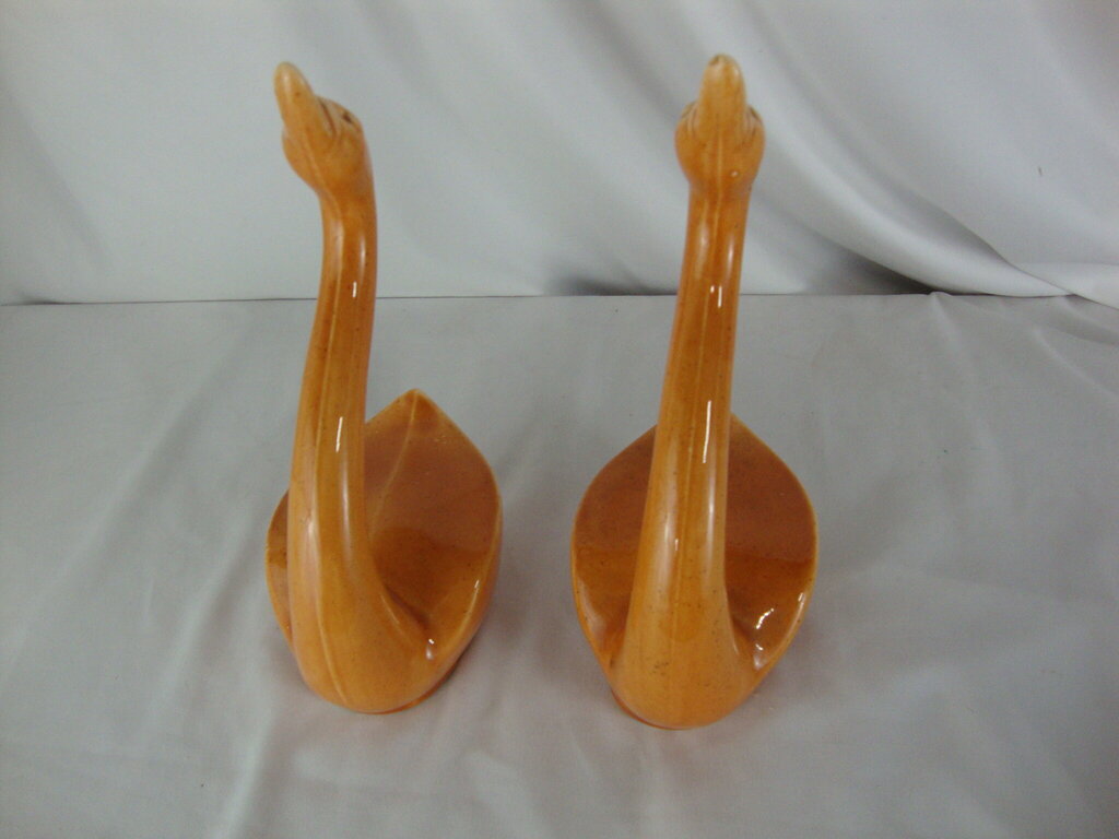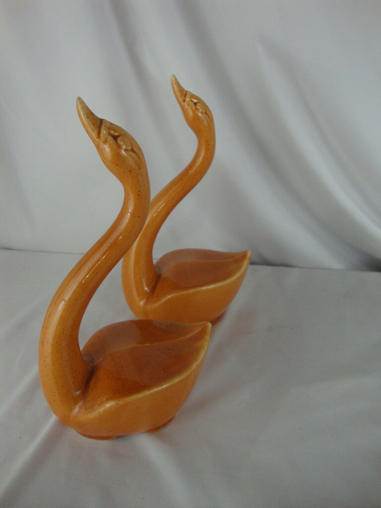 MCM adorable orange speckle ceramic upright head graceful swans with short leaf shape body. Swans have minimal wear/tear and measure about 10" beak height by 5" body length by 3 1/2" body width. If you choose to arrange to have an item shipped please make sure to insure the shipment as we are not responsible for damage that occurs in shipping. All items are sold “As Is” and all sales are final. Most pieces are one of a kind and can not be replaced. We will give you as much information as possible regarding the pieces condition including supplying additional pictures if needed. Due to the nature of antique and vintage items there may be blemishes, nicks or other imperfections as expected with age and use. If you want more information about an item, such as additional images or condition, please inquire! All items are located in our store at Standpipe Antiques, 502 O Neal Street, Belton, SC, 29627. Our hours are Wednesday through Saturday 10am to 5pm and Sundays 12-5pm. Come by and see us!