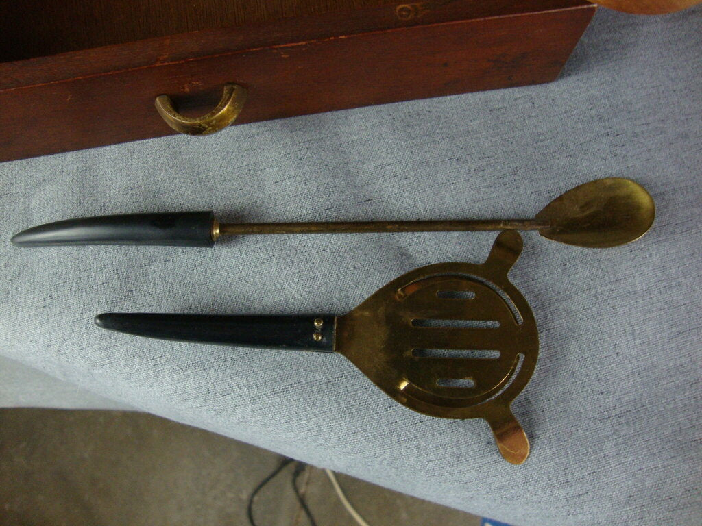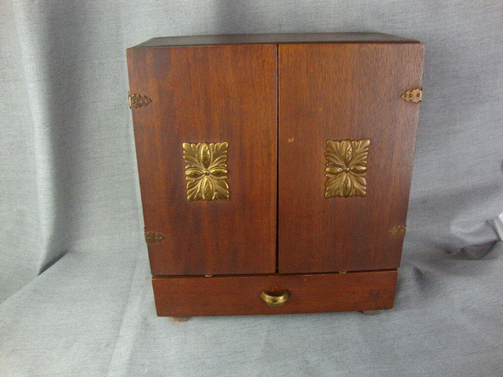 MCM fabulous tabletop bar cabinet with solid wood two door dovetailed cabinet with brass hardware with lower drawer that is attached to upper doors with door cup holders and inner dividers with two bar tools as shown. Bar has wear/tear, finish loss, dings to cabinet and measures about 14" height by 12 1/4" width by 6 1/4" depth. If you choose to arrange to have an item shipped please make sure to insure the shipment as we are not responsible for damage that occurs in shipping. All items are sold “As Is” and all sales are final. Most pieces are one of a kind and can not be replaced. We will give you as much information as possible regarding the pieces condition including supplying additional pictures if needed. Due to the nature of antique and vintage items there may be blemishes, nicks or other imperfections as expected with age and use. If you want more information about an item, such as additional images or condition, please inquire! All items are located in our store at Standpipe Antiques, 502 O Neal Street, Belton, SC, 29627. Our hours are Wednesday through Saturday 10am to 5pm, Sundays 12-5pm. Come by and see us!