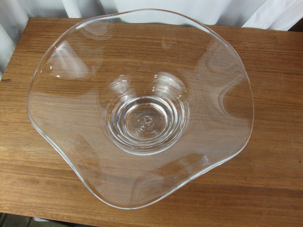 Lovely modern Simon Pearce Chelsea clear glass decor bowl with small round base and large flowing top edges. Bowl measures about 6 1/2" height by 13" top diameteter by 4" base diameter. If you choose to arrange to have an item shipped please make sure to insure the shipment as we are not responsible for damage that occurs in shipping. All items are sold “As Is” and all sales are final. Most pieces are one of a kind and can not be replaced. We will give you as much information as possible regarding the pieces condition including supplying additional pictures if needed. Due to the nature of antique and vintage items there may be blemishes, nicks or other imperfections as expected with age and use. If you want more information about an item, such as additional images or condition, please inquire! All items are located in our store at Standpipe Antiques, 502 O Neal Street, Belton, SC, 29627. Our hours are Wednesday through Saturday 10am to 5pm, and Sundays 12-5pm. Come by and see us!