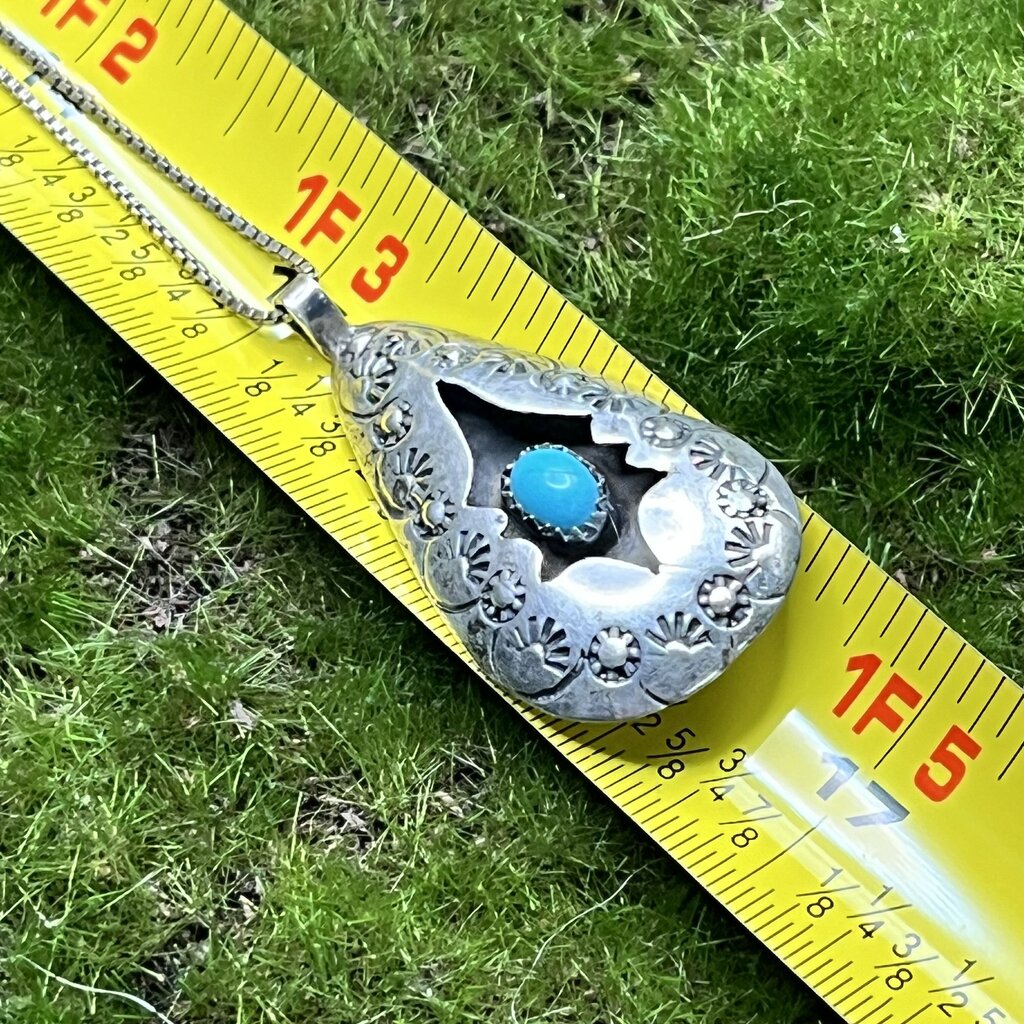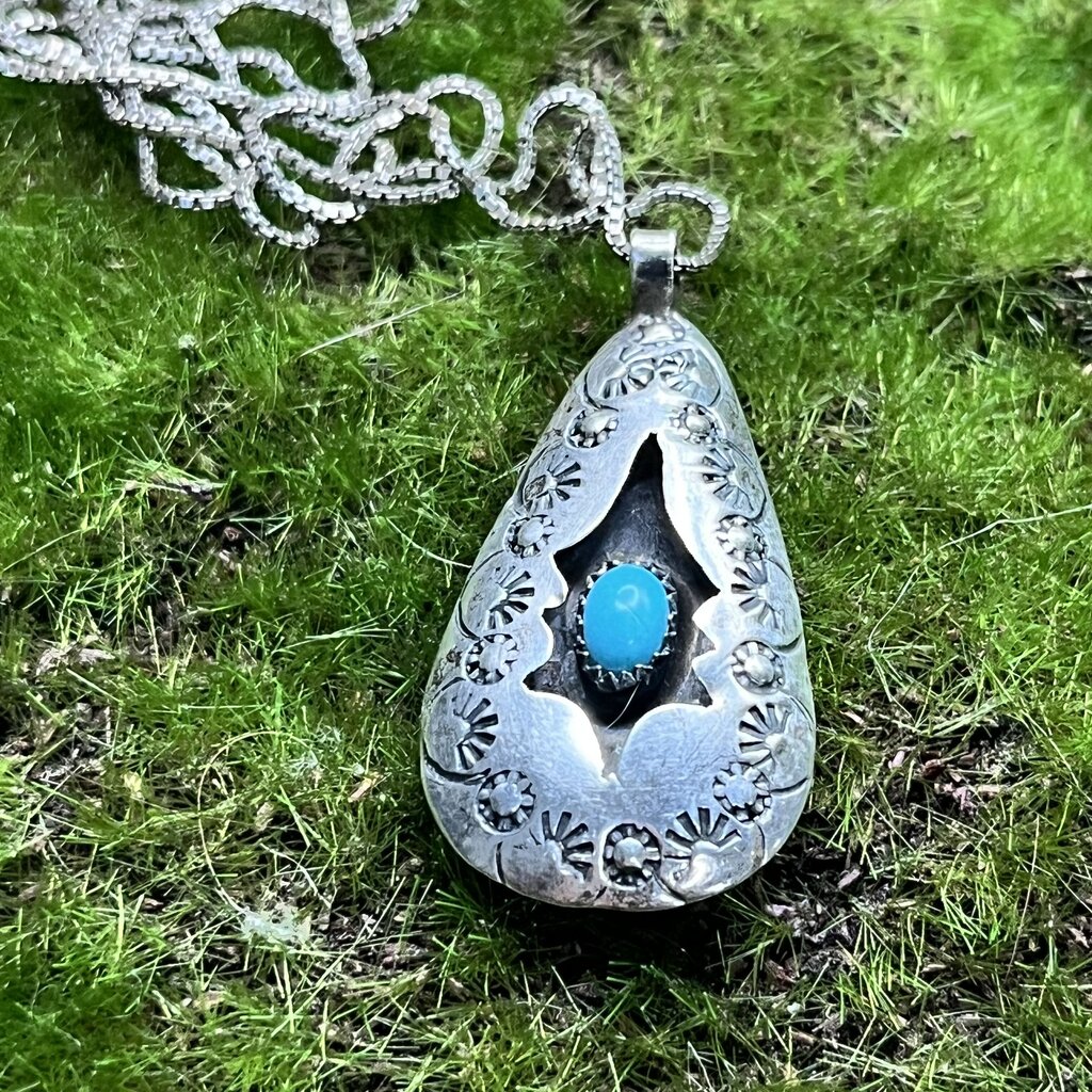The patterning and style of the Native American or First Nations people is one of my favorites. Turquoise is one of my favorite stones as well. This pendant has both! carry a little bit of history with you!