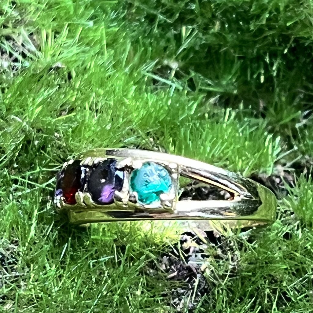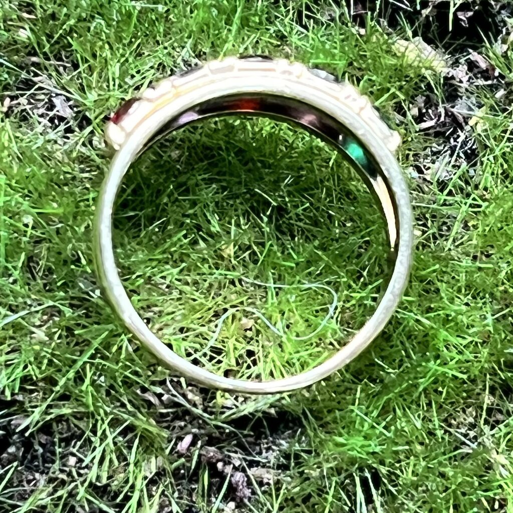 This solid gold ring has settings for five nice stones. It is a great starter base to add whatever color you want. Two of the stones are in excellent condition, two are abraded, and one is chipped. Take this piece to a jeweler and for a fraction of the price of a new one, you can have a gorgeous new ring.