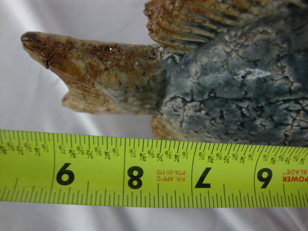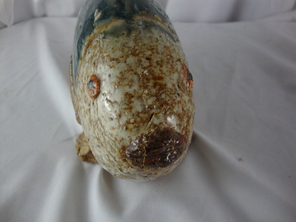 Adorable rustic large clay fish sculpture figure with blue/tan textured body with tall top and back fins and tail. Fish has wear/tear and measures about 5 1/2" height by 9" length by 2" middle depth. If you choose to arrange to have an item shipped please make sure to insure the shipment as we are not responsible for damage that occurs in shipping. All items are sold “As Is” and all sales are final. Most pieces are one of a kind and can not be replaced. We will give you as much information as possible regarding the pieces condition including supplying additional pictures if needed. Due to the nature of antique and vintage items there may be blemishes, nicks or other imperfections as expected with age and use. If you want more information about an item, such as additional images or condition, please inquire! All items are located in our store at Standpipe Antiques, 502 O Neal Street, Belton, SC, 29627. Our hours are Wednesday through Saturday 10am to 5pm and Sundays 12-5pm. Come by and see us!