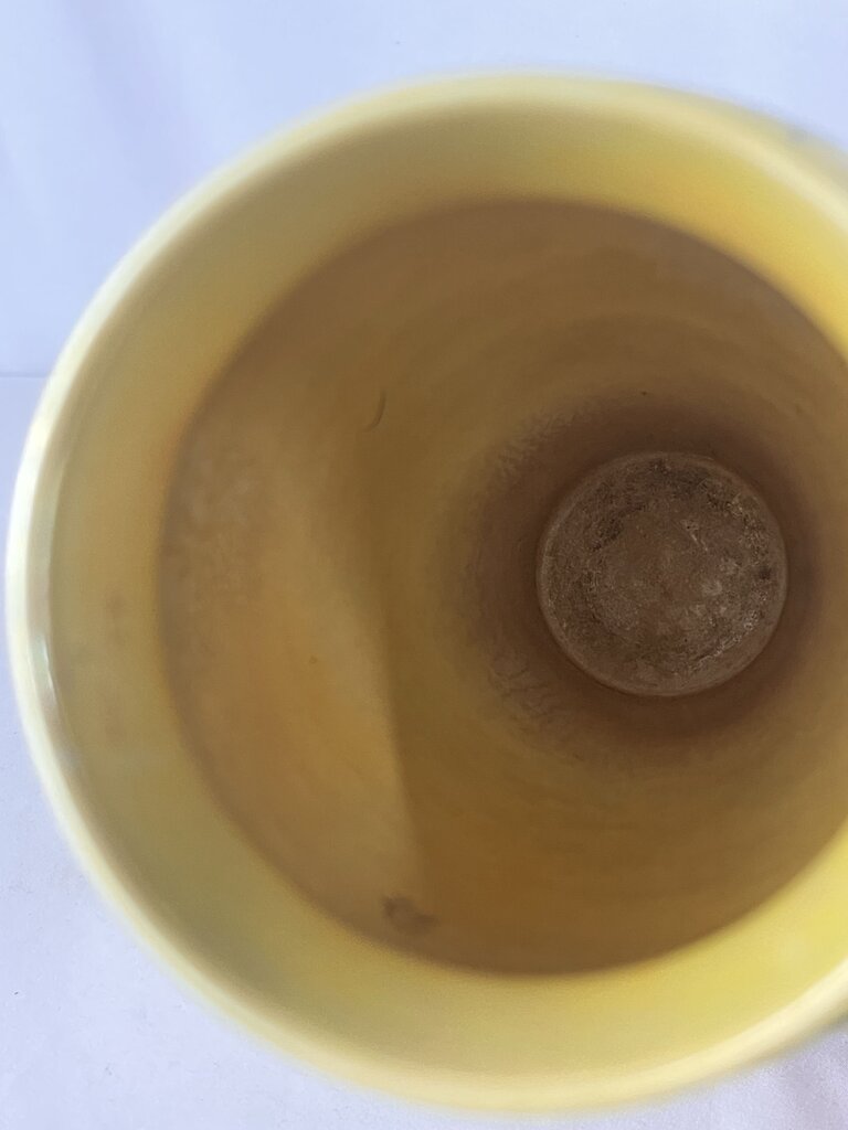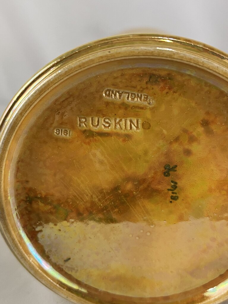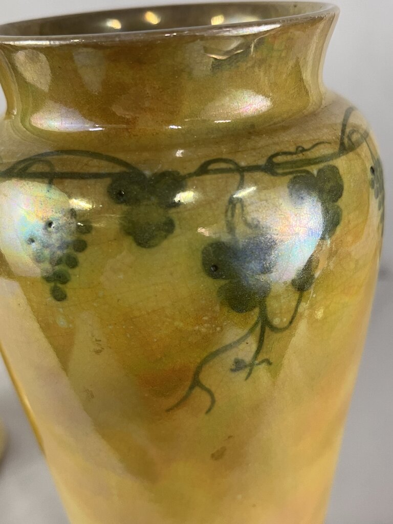 EACH. TWO AVAILABLE. This antique vase made in 1918 by Ruskin out of England is a beautiful lustre yellow with green grape vines encircling the top. Ruskin made identification easy by date, name, and location stamping the bottom of their items. These are high quality thin and dense clay which will continue to look beautiful for centuries.