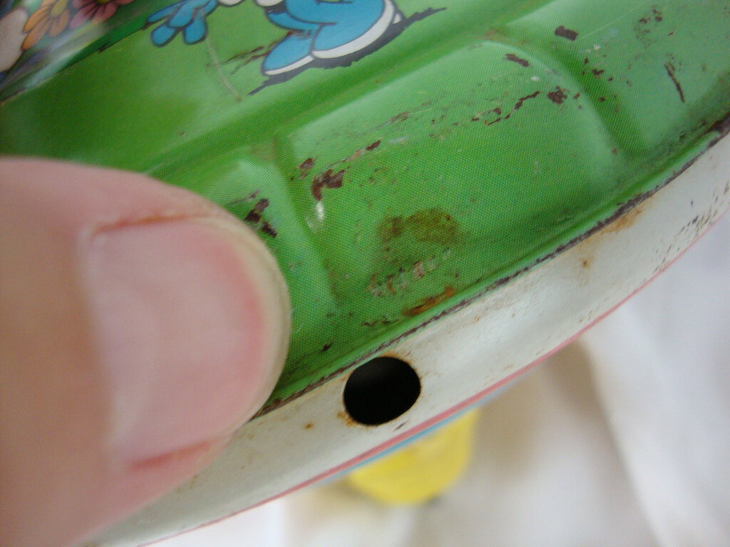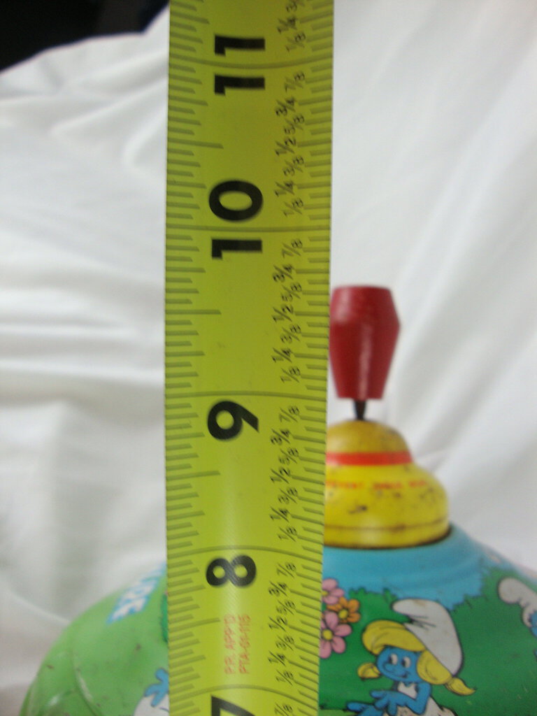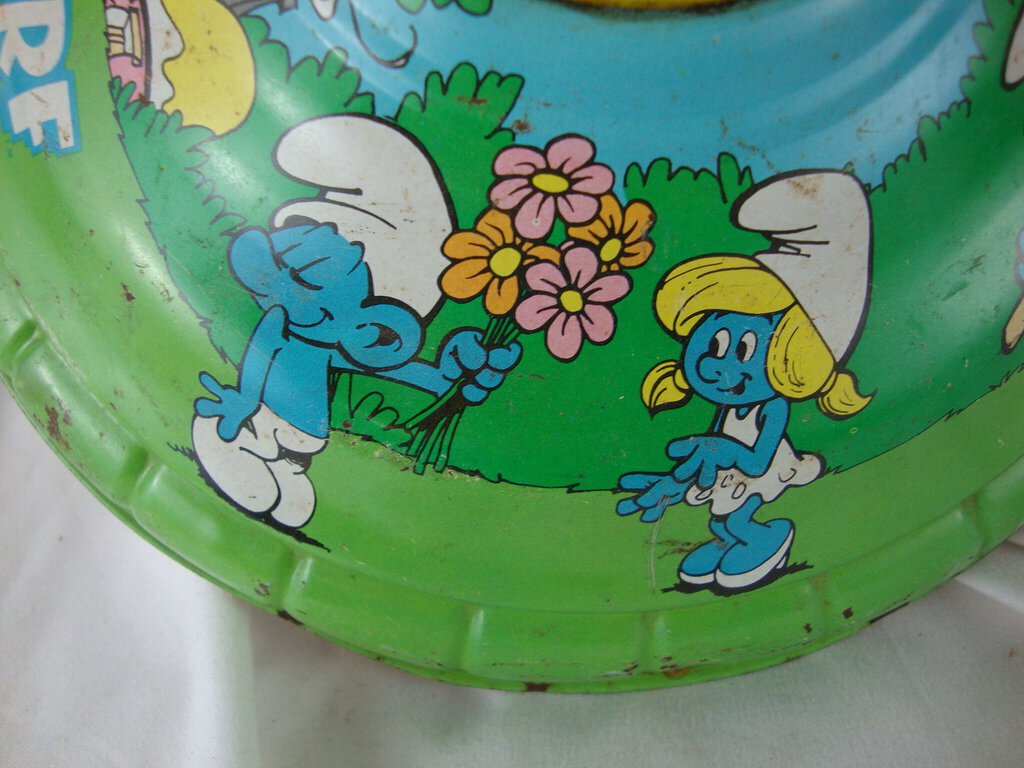 Vintage adorable circa 1982 vibrant SMURF tin litho spinning metal large top toy with top red wooden handle, fun green/blue Smurf scenes and underneath bright cocentric rings. Top has wear/tear, top handle comes up but does not spin normal appears to need oiling/cleaning, finish loss, scratches, dents/dings and measures about 9" height by 8 1/2" middle body diameter. If you choose to arrange to have an item shipped please make sure to insure the shipment as we are not responsible for damage that occurs in shipping. All items are sold “As Is” and all sales are final. Most pieces are one of a kind and can not be replaced. We will give you as much information as possible regarding the pieces condition including supplying additional pictures if needed. Due to the nature of antique and vintage items there may be blemishes, nicks or other imperfections as expected with age and use. If you want more information about an item, such as additional images or condition, please inquire! All items are located in our store at Standpipe Antiques, 502 O Neal Street, Belton, SC, 29627. Our hours are Wednesday through Friday 10am-6pm, Saturday 10am to 5pm and Sundays 12-5pm. Come by and see us!