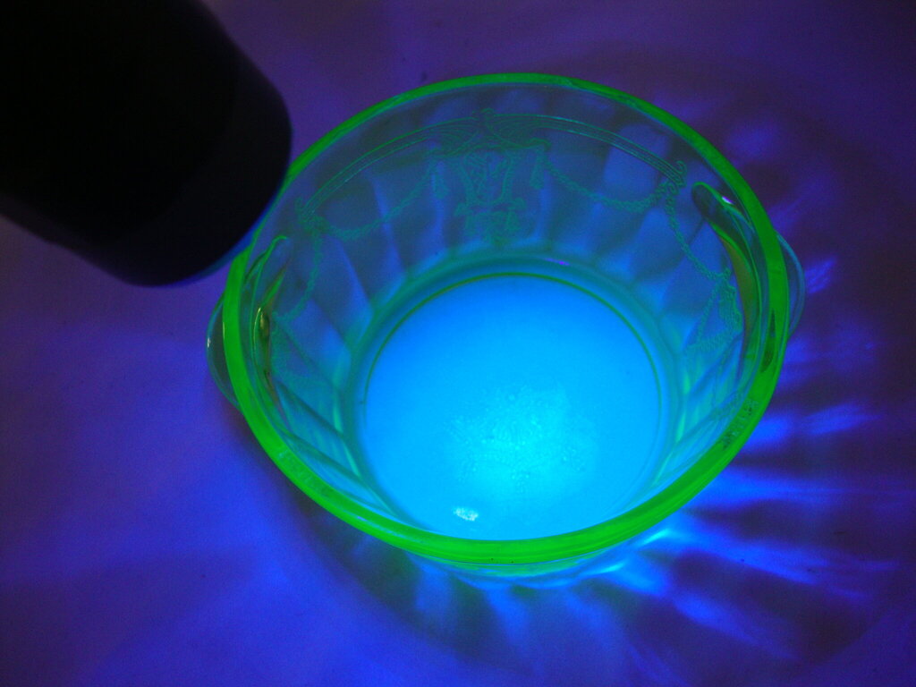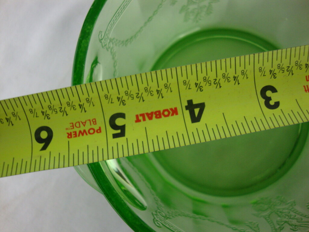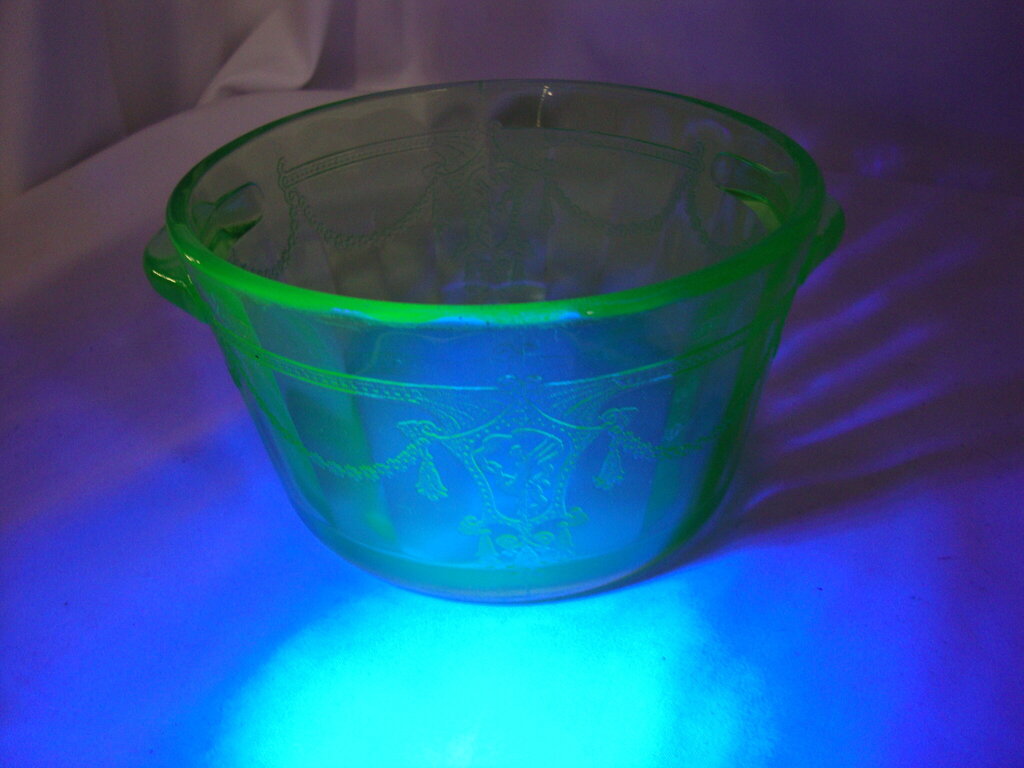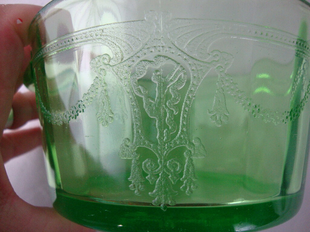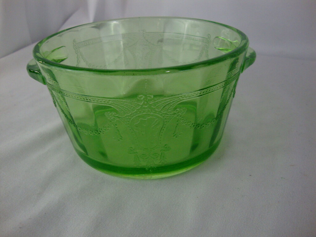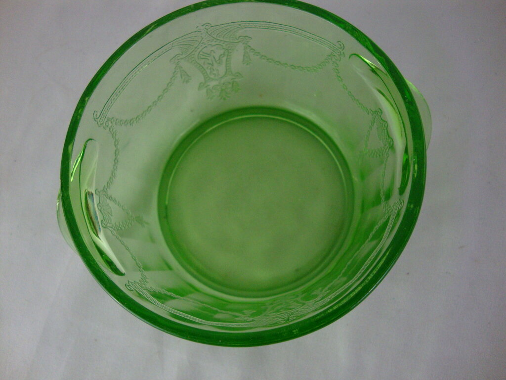 Vintage charming Anchor Hocking Cameo Ballerina pattern uranium vaseline glass handled ice tub bowl with small side handles. Tub has wear/tear, production flaws and measures about 3" height by 5 1/4" top diameter.