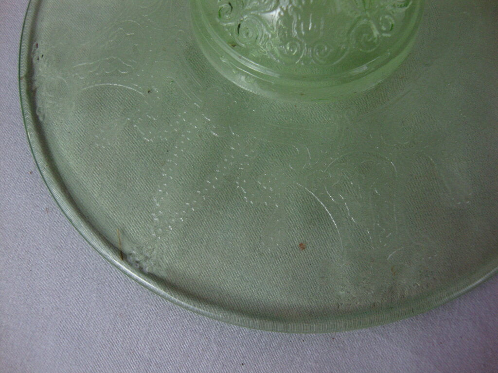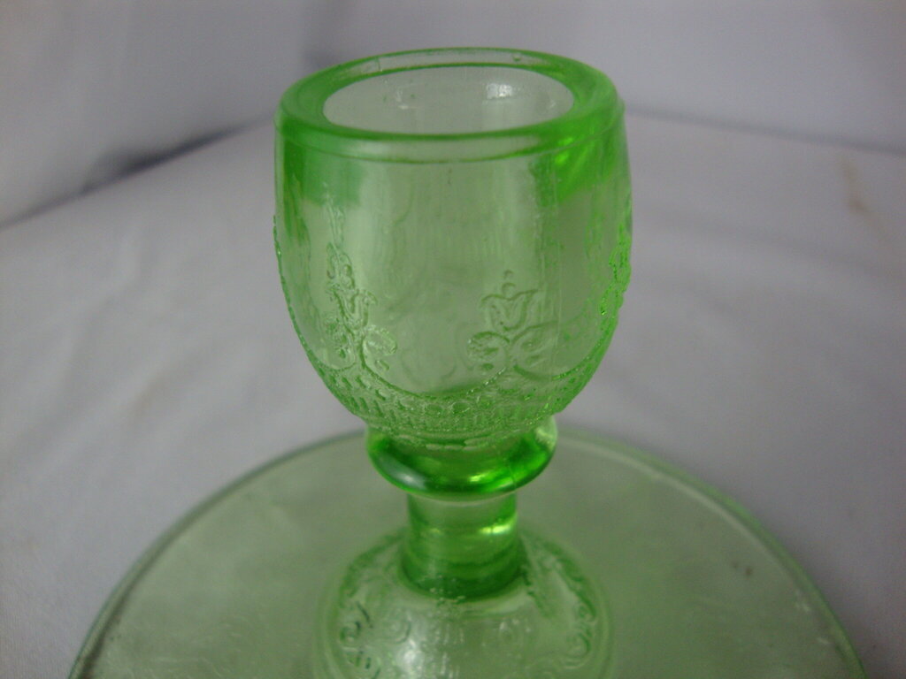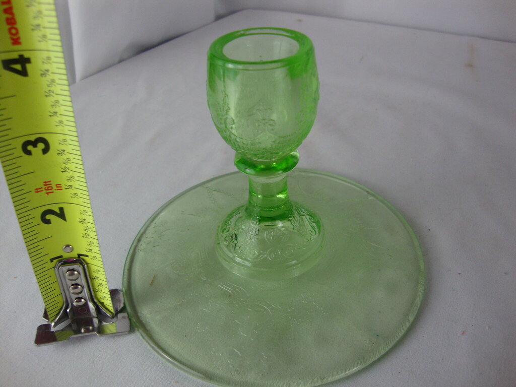 Vintage Anchor Hocking uranium vaseline glass Cameo pattern single glass candleholder with large round base and short taper holder. Holder has wear/tear and measures 3 1/2" middle height by 5" base diameter by 1" top diameter. If you choose to arrange to have an item shipped please make sure to insure the shipment as we are not responsible for damage that occurs in shipping. All items are sold “As Is” and all sales are final. Most pieces are one of a kind and can not be replaced. We will give you as much information as possible regarding the pieces condition including supplying additional pictures if needed. Due to the nature of antique and vintage items there may be blemishes, nicks or other imperfections as expected with age and use. If you want more information about an item, such as additional images or condition, please inquire! All items are located in our store at Standpipe Antiques, 502 O Neal Street, Belton, SC, 29627. Our hours are Wednesday through Saturday 10am to 5pm, Sundays 12-5pm. Come by and see us!