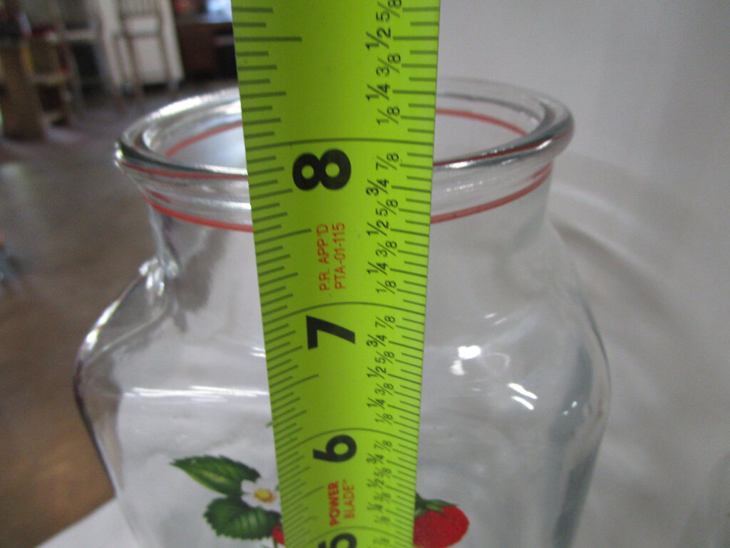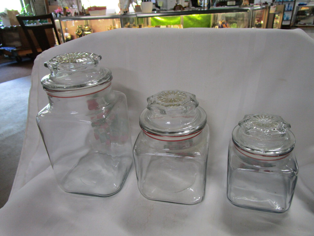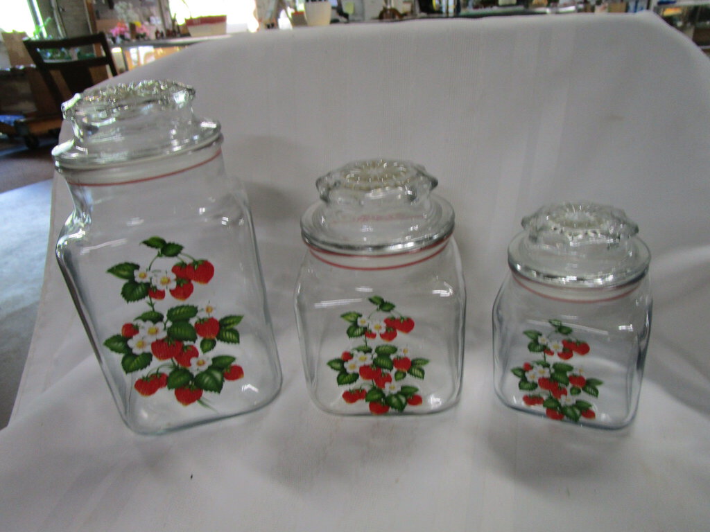Vintage adorable Anchor Hocking kitchen canister set with clear glass bodies and front vibrant strawberry motif with heavy pull off glass lids with inner plastic seal. Set has wear/tear, finish loss, scratches/stains and largest is 7 1/2" height by 3 3/4" top opening, middle is about 5 1/2" height by 3 3/4" top opening and smallest is 4" height by 3" top opening. If you choose to arrange to have an item shipped please make sure to insure the shipment as we are not responsible for damage that occurs in shipping. All items are sold “As Is” and all sales are final. Most pieces are one of a kind and can not be replaced. We will give you as much information as possible regarding the pieces condition including supplying additional pictures if needed. Due to the nature of antique and vintage items there may be blemishes, nicks or other imperfections as expected with age and use. If you want more information about an item, such as additional images or condition, please inquire! All items are located in our store at Standpipe Antiques, 502 O Neal Street, Belton, SC, 29627. Our hours are Wednesday through Friday 10am-6pm, Saturday 10am to 5pm and Sundays 12-5pm. Come by and see us!