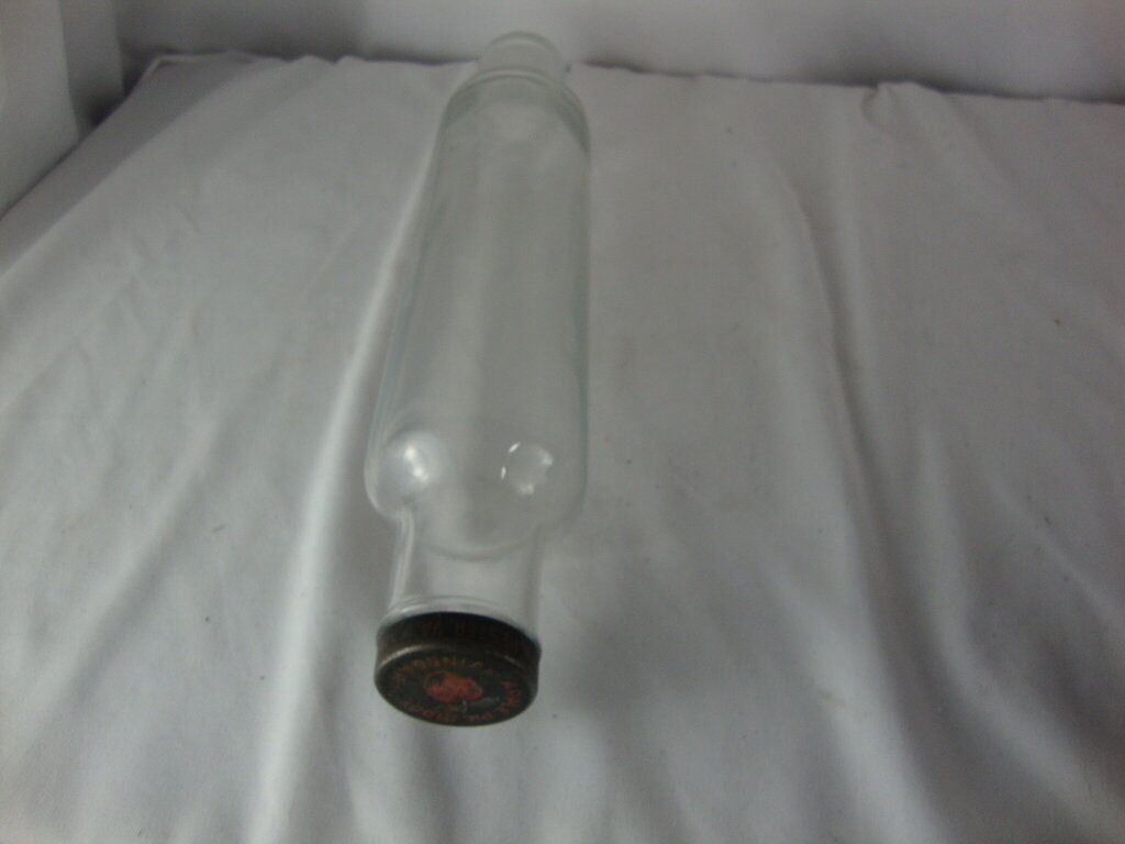 Vintage adorable Apple Pie Vinegar jar from 1930s in the shape of a glass rolling pin that can be filled and used as a rolling pin complete with original metal twist cap. Pin has wear/tear, finish loss and measures about 13 1/2" length by 1 1/2" end diameters. If you choose to arrange to have an item shipped please make sure to insure the shipment as we are not responsible for damage that occurs in shipping. All items are sold “As Is” and all sales are final. Most pieces are one of a kind and can not be replaced. We will give you as much information as possible regarding the pieces condition including supplying additional pictures if needed. Due to the nature of antique and vintage items there may be blemishes, nicks or other imperfections as expected with age and use. If you want more information about an item, such as additional images or condition, please inquire! All items are located in our store at Standpipe Antiques, 502 O Neal Street, Belton, SC, 29627. Our hours are Wednesday through Saturday 10am to 5pm, Sundays 12-5pm. Come by and see us!