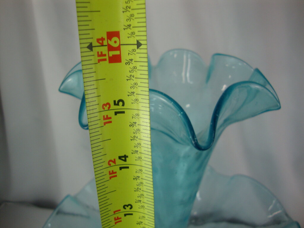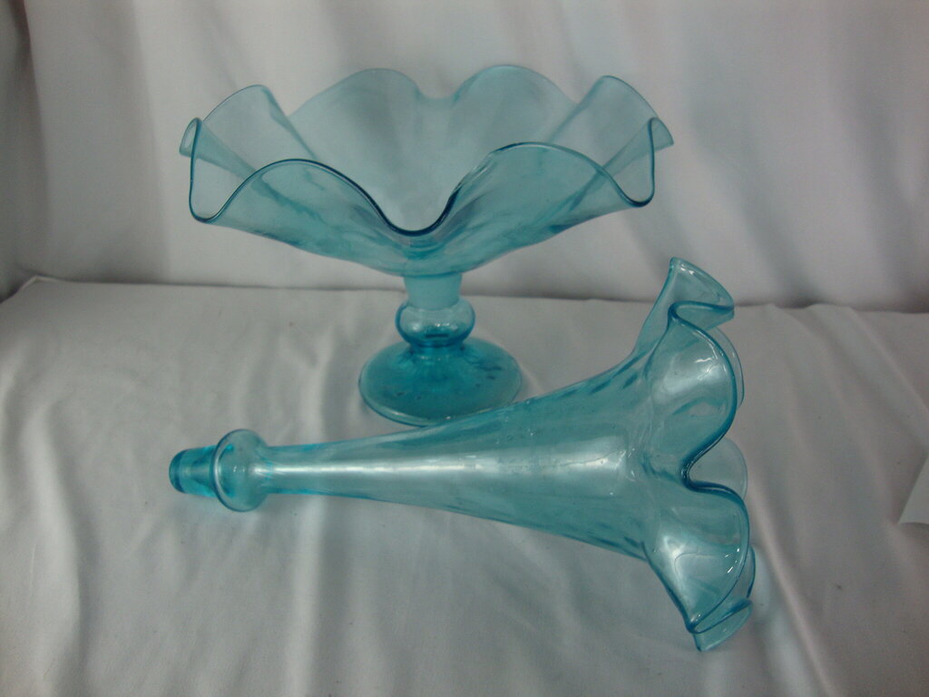 Gorgeous vintage to antique aqua glass one horn epergne with pedestal bowl with wavy edges. Epergne has wear/tear, glass bubbles, possible flea bites and measures about 15" horn height by 8" bowl height by 11" bowl top diameter by 4" base diameter by 6" horn top diameter by 12" horn length. If you choose to arrange to have an item shipped please make sure to insure the shipment as we are not responsible for damage that occurs in shipping. All items are sold “As Is” and all sales are final. Most pieces are one of a kind and can not be replaced. We will give you as much information as possible regarding the pieces condition including supplying additional pictures if needed. Due to the nature of antique and vintage items there may be blemishes, nicks or other imperfections as expected with age and use. If you want more information about an item, such as additional images or condition, please inquire! All items are located in our store at Standpipe Antiques, 502 O Neal Street, Belton, SC, 29627. Our hours are Wednesday through Saturday 10am to 5pm, Sundays 12-5pm. Come by and see us!