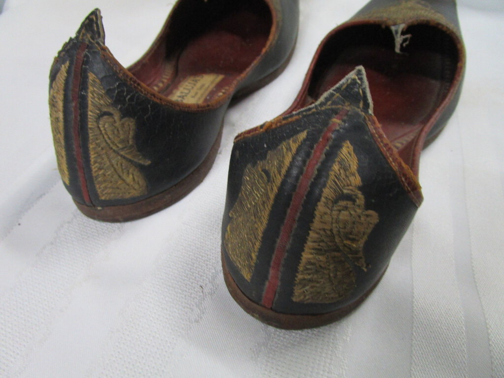 Handsome Baluja's New Delhi handmade leather ceremonial wedding slippers in navy blue leather body with tan embroidery front and tips and back with curled up front toes with extra detailing underneath and pointed backs. Slippers have wear, cracking, loose/missing embroidery and measures about 11" total length and 3" middle width, shoes have no size but based on about 10" back to straight across front shoe size would be approximately mens 8. If you choose to arrange to have an item shipped please make sure to insure the shipment as we are not responsible for damage that occurs in shipping. All items are sold “As Is” and all sales are final. Most pieces are one of a kind and can not be replaced. We will give you as much information as possible regarding the pieces condition including supplying additional pictures if needed. Due to the nature of antique and vintage items there may be blemishes, nicks or other imperfections as expected with age and use. If you want more information about an item, such as additional images or condition, please inquire! All items are located in our store at Standpipe Antiques, 502 O Neal Street, Belton, SC, 29627. Our hours are Wednesday through Friday 10am to 6pm, Saturday 10am to 5pm and Sundays 12-5pm. Come by and see us!