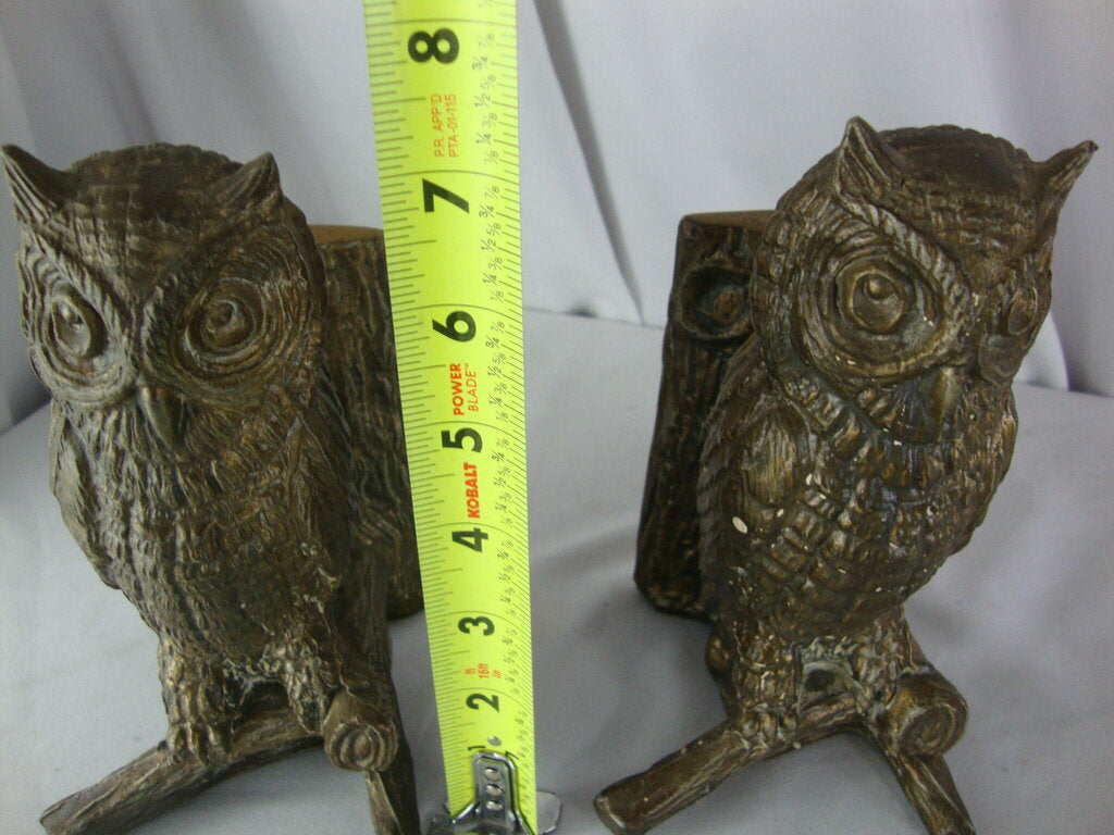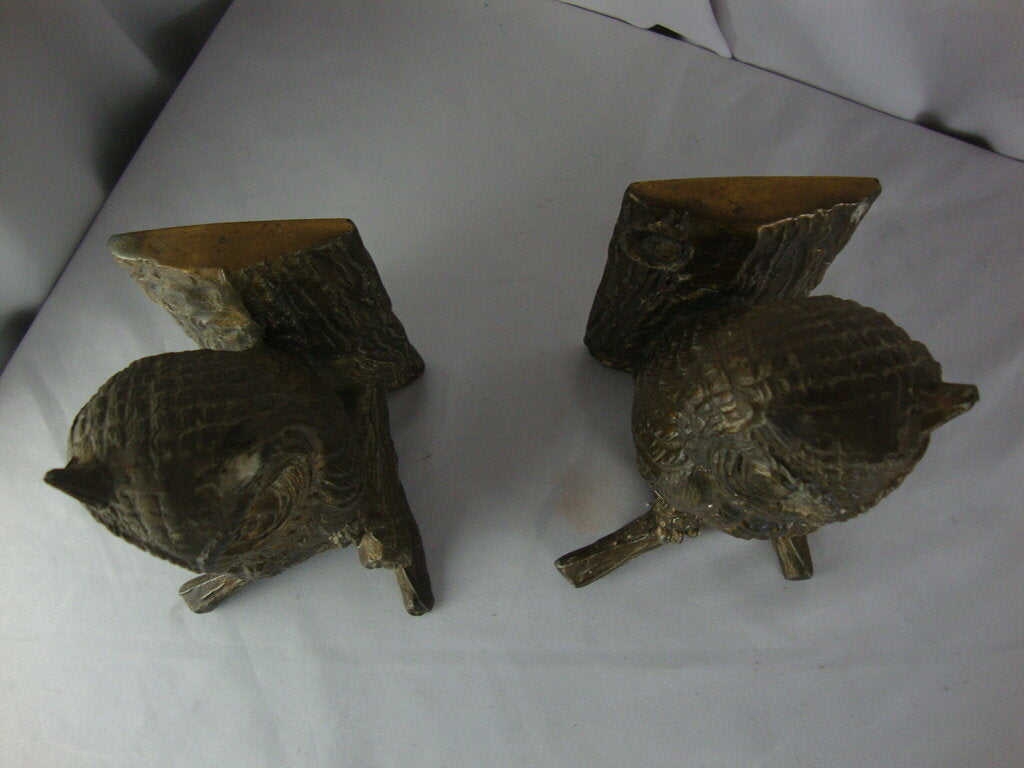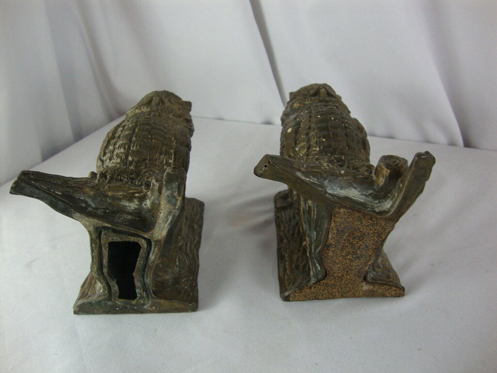 Vintage adorable brass woodland owl sitting on tree branch with highly textured owl body and faux tree texture. Bookends have wear/tear, one bookend bottom is missing and weighted inner material is missing so bookend is about 1/2 weight of other, finish loss, spotting and measure about 7" height by 5 1/2" back height by 4" base front width. If you choose to arrange to have an item shipped please make sure to insure the shipment as we are not responsible for damage that occurs in shipping. All items are sold “As Is” and all sales are final. Most pieces are one of a kind and can not be replaced. We will give you as much information as possible regarding the pieces condition including supplying additional pictures if needed. Due to the nature of antique and vintage items there may be blemishes, nicks or other imperfections as expected with age and use. If you want more information about an item, such as additional images or condition, please inquire! All items are located in our store at Standpipe Antiques, 502 O Neal Street, Belton, SC, 29627. Our hours are Wednesday through Saturday 10am to 5pm and Sundays 12-5pm. Come by and see us!