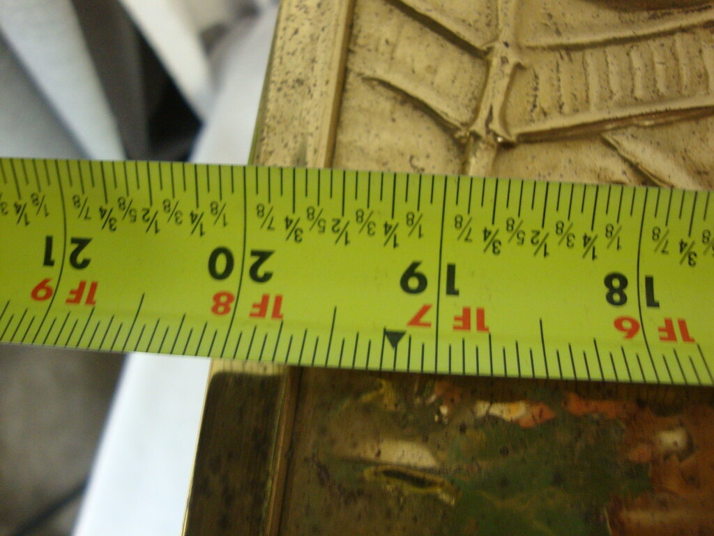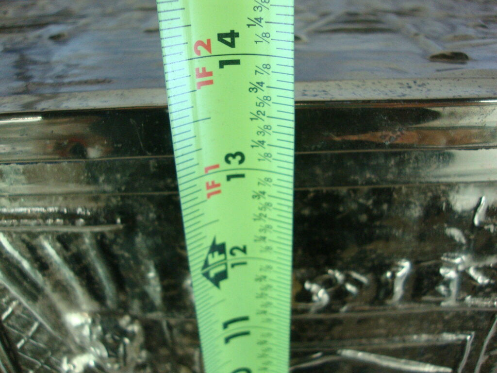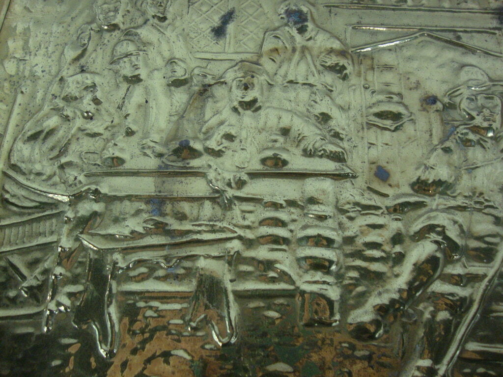 Vintage charming brass repousse English pub scene on top and front with side rectangle pattern with wood inner box. Box has wear/tear, dings, spots, finish loss and measures about 13 1/2" height by 20" length by 12 1/2" depth. If you choose to arrange to have an item shipped please make sure to insure the shipment as we are not responsible for damage that occurs in shipping. All items are sold “As Is” and all sales are final. Most pieces are one of a kind and can not be replaced. We will give you as much information as possible regarding the pieces condition including supplying additional pictures if needed. Due to the nature of antique and vintage items there may be blemishes, nicks or other imperfections as expected with age and use. If you want more information about an item, such as additional images or condition, please inquire! All items are located in our store at Standpipe Antiques, 502 O Neal Street, Belton, SC, 29627. Our hours are Wednesday through Saturday 10am to 5pm, Sundays 12-5pm. Come by and see us!