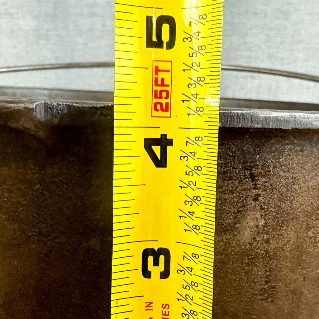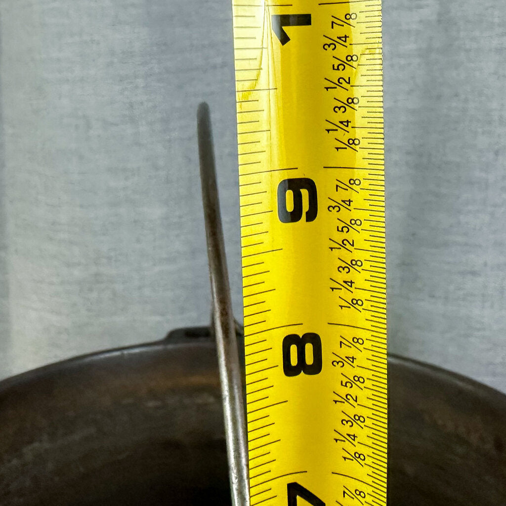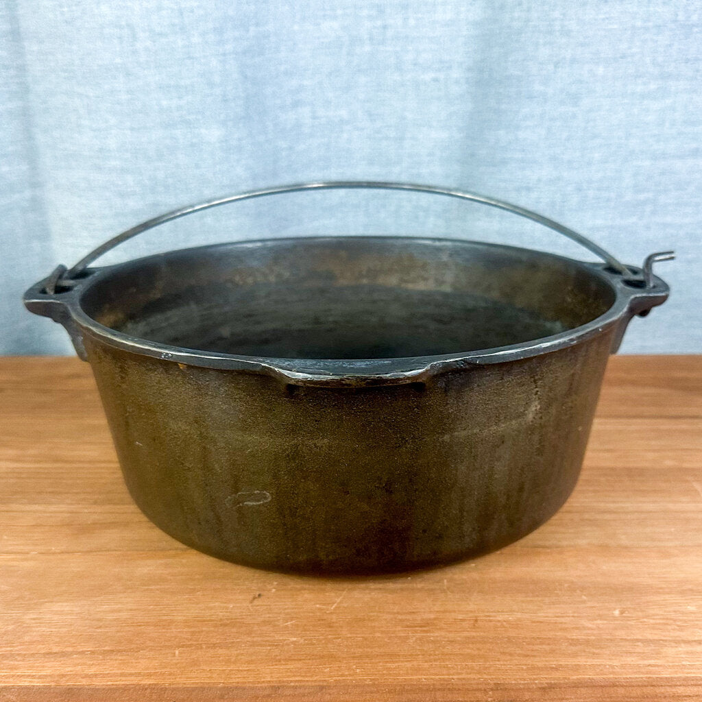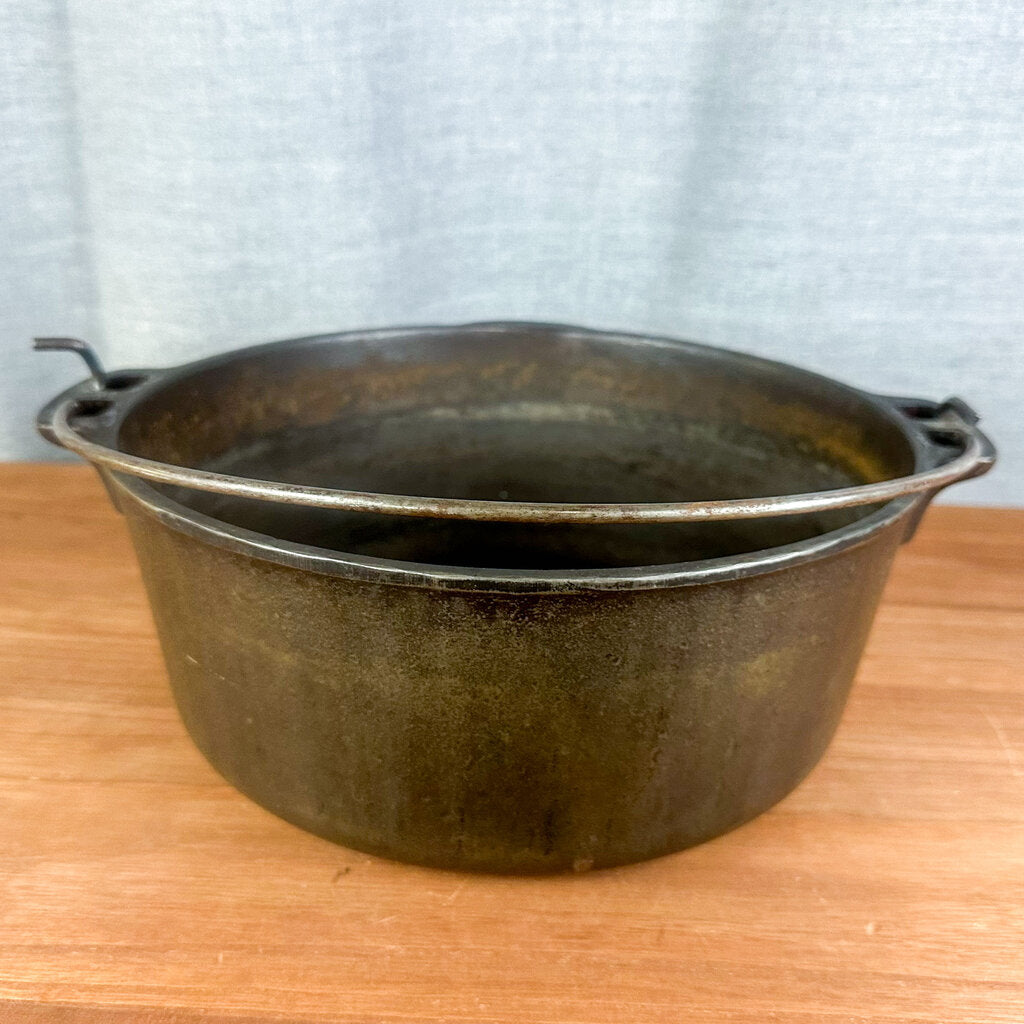 Vintage cast-iron 5 quart cooking pot with bucket style handle. A very cool piece. Pot has wear/tear, rust, scratches, stains, and discoloration.