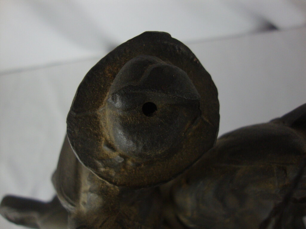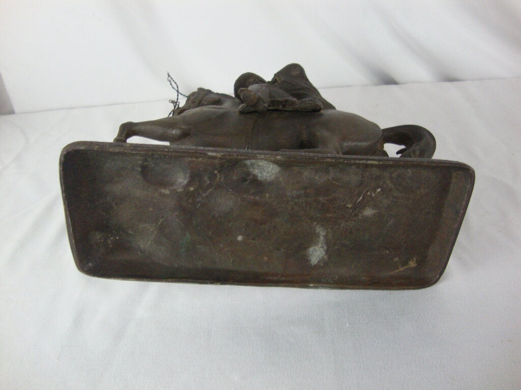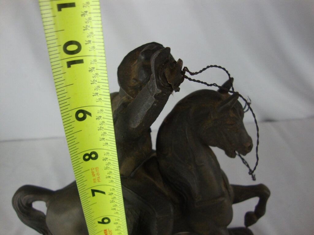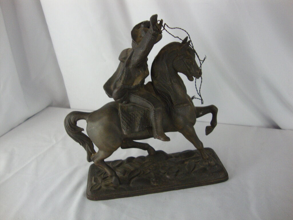 Vintage cast metal cowboy Buffalo Bill riding prancing horse with metal 'lasso' rope and rectangular base with leaf pattern. Figurine has wear/tear, finish loss, tarnish/rust, multiple mold pin holes per photos and measures about 10" head height by 9" base length by 3 1/2" base depth. If you choose to arrange to have an item shipped please make sure to insure the shipment as we are not responsible for damage that occurs in shipping. All items are sold “As Is” and all sales are final. Most pieces are one of a kind and can not be replaced. We will give you as much information as possible regarding the pieces condition including supplying additional pictures if needed. Due to the nature of antique and vintage items there may be blemishes, nicks or other imperfections as expected with age and use. If you want more information about an item, such as additional images or condition, please inquire! All items are located in our store at Standpipe Antiques, 502 O Neal Street, Belton, SC, 29627. Our hours are Wednesday through Saturday 10am to 5pm and Sundays 12-5pm. Come by and see us!