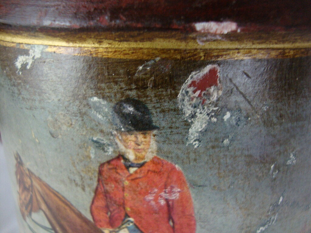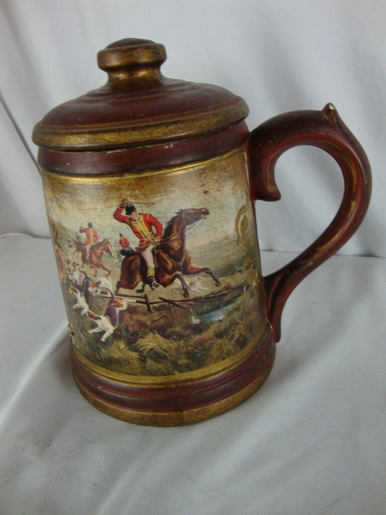 Charming vintage large handled stein canister with English hunt scene transfer with red coated riders, dogs and horses with burgundy body with scrollwork handle. Canister has wear/tear, chips, finish loss, transfer ripped/missing in several spots and measures 8" body height by 5" top diameter by 8" total width. If you choose to arrange to have an item shipped please make sure to insure the shipment as we are not responsible for damage that occurs in shipping. All items are sold “As Is” and all sales are final. Most pieces are one of a kind and can not be replaced. We will give you as much information as possible regarding the pieces condition including supplying additional pictures if needed. Due to the nature of antique and vintage items there may be blemishes, nicks or other imperfections as expected with age and use. If you want more information about an item, such as additional images or condition, please inquire! All items are located in our store at Standpipe Antiques, 502 O Neal Street, Belton, SC, 29627. Our hours are Wednesday through Saturday 10am to 5pm and Sundays 12-5pm. Come by and see us!