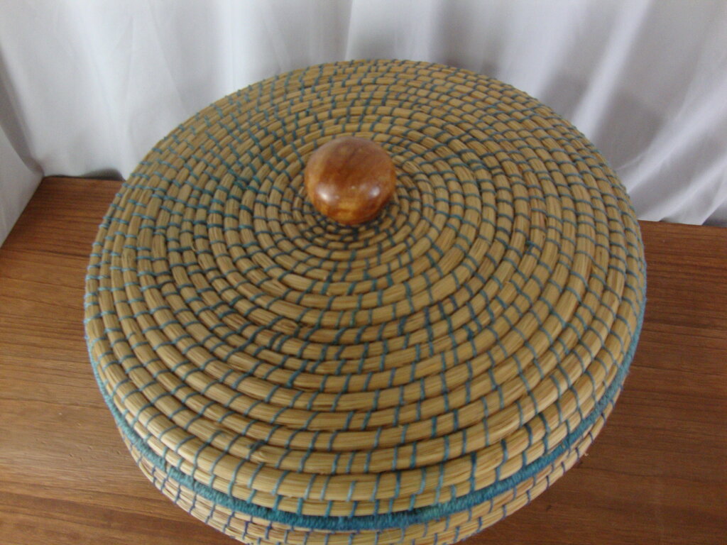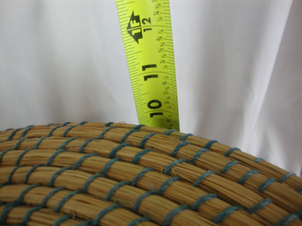 Vintage adorable coiled sweetgrass large basket with tan body with blue threading and lid trim with top wood handle. Basket has wear/tear, few loose pieces, basket body is angled so base is about 8" to almost 10" height by 14" top diameter. If you choose to arrange to have an item shipped please make sure to insure the shipment as we are not responsible for damage that occurs in shipping. All items are sold “As Is” and all sales are final. Most pieces are one of a kind and can not be replaced. We will give you as much information as possible regarding the pieces condition including supplying additional pictures if needed. Due to the nature of antique and vintage items there may be blemishes, nicks or other imperfections as expected with age and use. If you want more information about an item, such as additional images or condition, please inquire! All items are located in our store at Standpipe Antiques, 502 O Neal Street, Belton, SC, 29627. Our hours are Wednesday through Friday 10am-6pm, Saturday 10am to 5pm and Sundays 12-5pm. Come by and see us!
