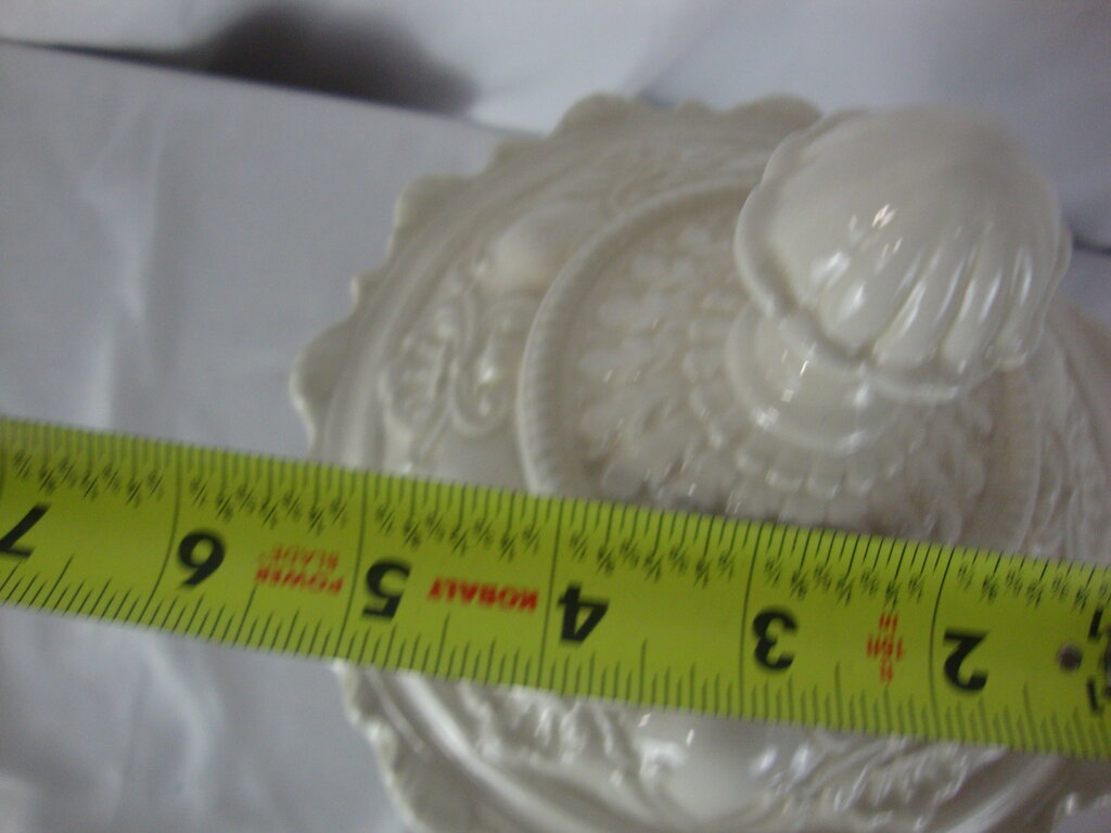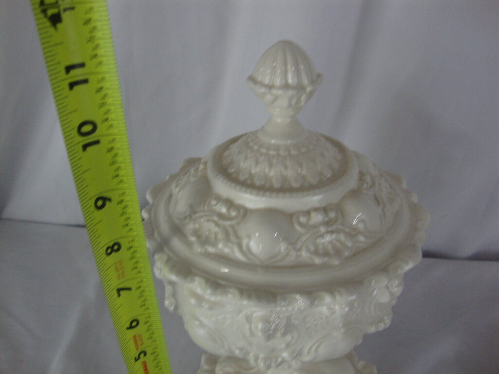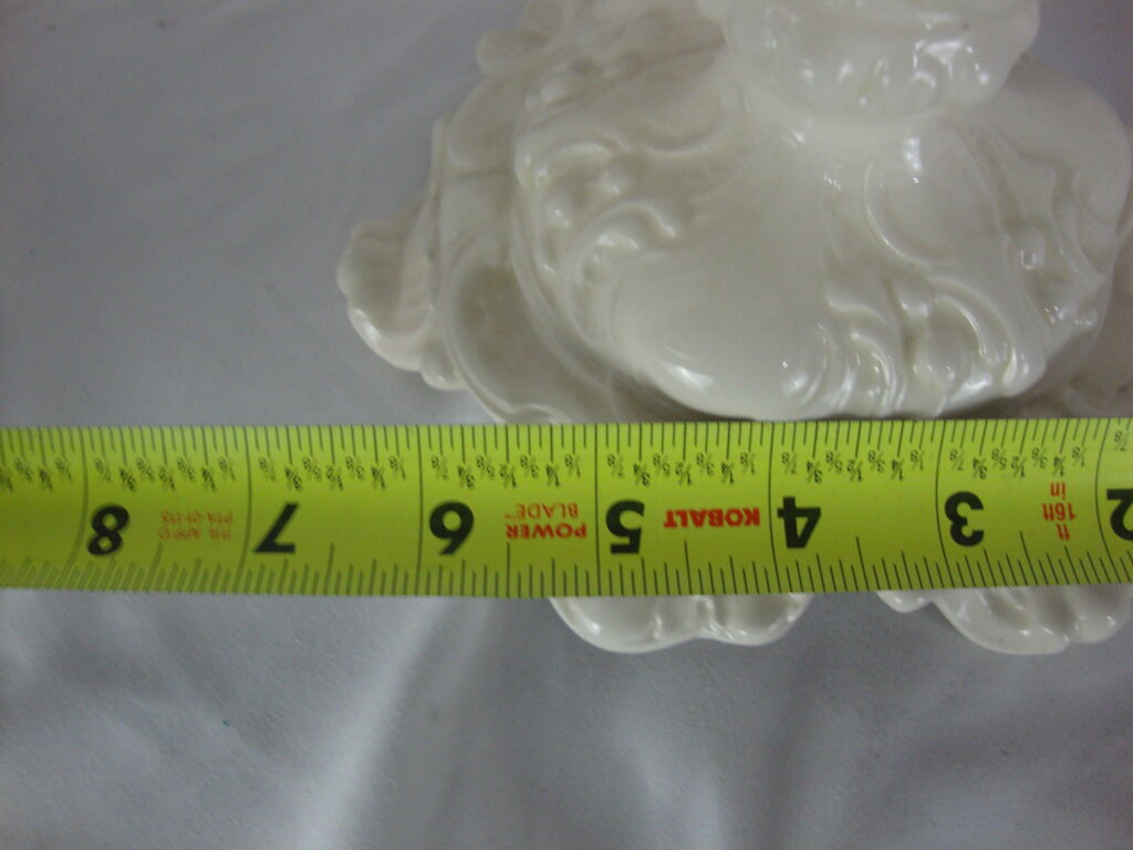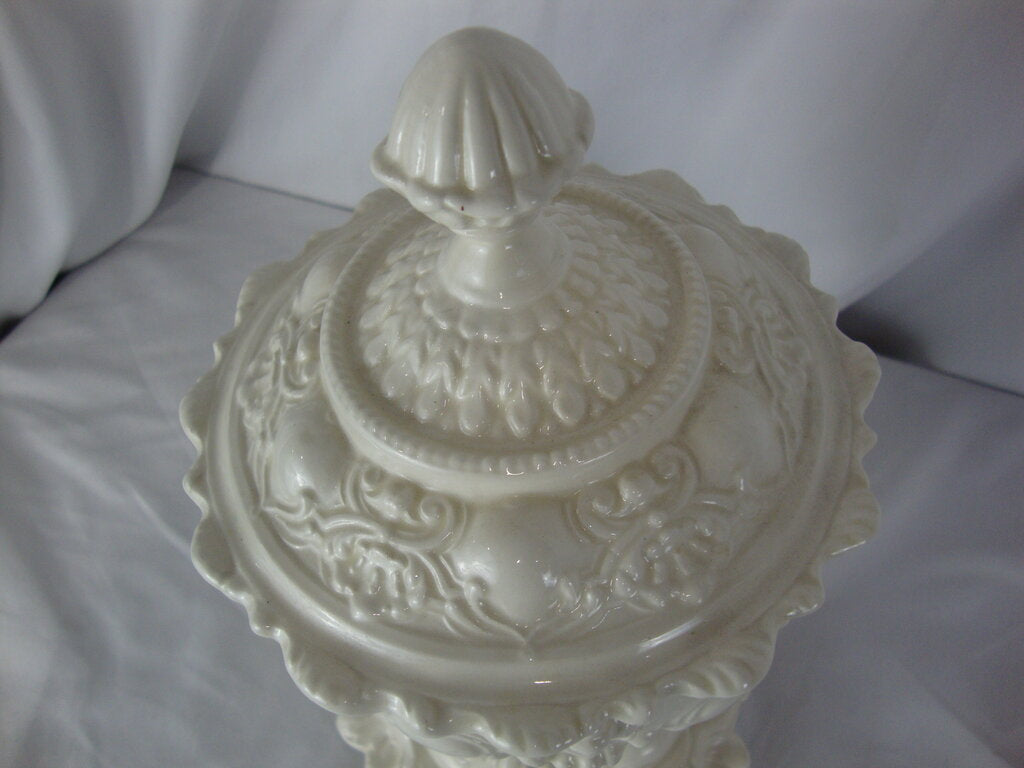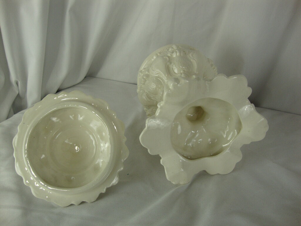 Vintage intricate cream ceramic pedestal bowl dish with raised scrollwork pattern with top bowl with dome lid with middle finial handle. Bowl dish has wear/tear, aged and measures about 8" base and 11" top height by 5 1/2" bowl diameter top by 6" base diameter. If you choose to arrange to have an item shipped please make sure to insure the shipment as we are not responsible for damage that occurs in shipping. All items are sold “As Is” and all sales are final. Most pieces are one of a kind and can not be replaced. We will give you as much information as possible regarding the pieces condition including supplying additional pictures if needed. Due to the nature of antique and vintage items there may be blemishes, nicks or other imperfections as expected with age and use. If you want more information about an item, such as additional images or condition, please inquire! All items are located in our store at Standpipe Antiques, 502 O Neal Street, Belton, SC, 29627. Our hours are Wednesday through Saturday 10am to 5pm, Sundays 12-5pm. Come by and see us!