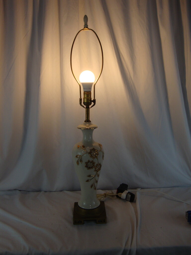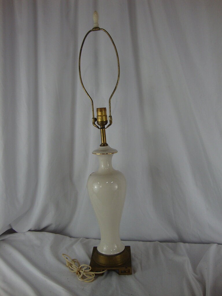 Vintage adorable cream and gold flower and leaf motif table lamp with square metal base and brass tall harp with older style plug and cream plastic finial. Lamp has wear/tear, finish loss, dings, tarnish, no shade and base measures 5 1/2" square by 17" ceramic base, 21" socket height. If you choose to arrange to have an item shipped please make sure to insure the shipment as we are not responsible for damage that occurs in shipping. All items are sold “As Is” and all sales are final. Most pieces are one of a kind and can not be replaced. We will give you as much information as possible regarding the pieces condition including supplying additional pictures if needed. Due to the nature of antique and vintage items there may be blemishes, nicks or other imperfections as expected with age and use. If you want more information about an item, such as additional images or condition, please inquire! All items are located in our store at Standpipe Antiques, 502 O Neal Street, Belton, SC, 29627. Our hours are Wednesday through Friday 10am to 6pm, Saturday 10am to 5pm and Sundays 12-5pm. Come by and see us!