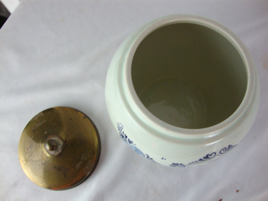 Vintage Delft Holland tobacco humidor reproduction jar with van Rossem's Toeback anno 1750 with front scene of man in gallows with metal lid with sponge intact. Jar humidor has wear/tear, surface stains, flaws, dings at bottom and measures about 3 1/2" bottom diameter by 6" height by 4" top diameter. If you choose to arrange to have an item shipped please make sure to insure the shipment as we are not responsible for damage that occurs in shipping. All items are sold “As Is” and all sales are final. Most pieces are one of a kind and can not be replaced. We will give you as much information as possible regarding the pieces condition including supplying additional pictures if needed. Due to the nature of antique and vintage items there may be blemishes, nicks or other imperfections as expected with age and use. If you want more information about an item, such as additional images or condition, please inquire! All items are located in our store at Standpipe Antiques, 502 O Neal Street, Belton, SC, 29627. Our hours are Wednesday through Saturday 10am to 5pm and Sundays 12-5pm so come by and see us!