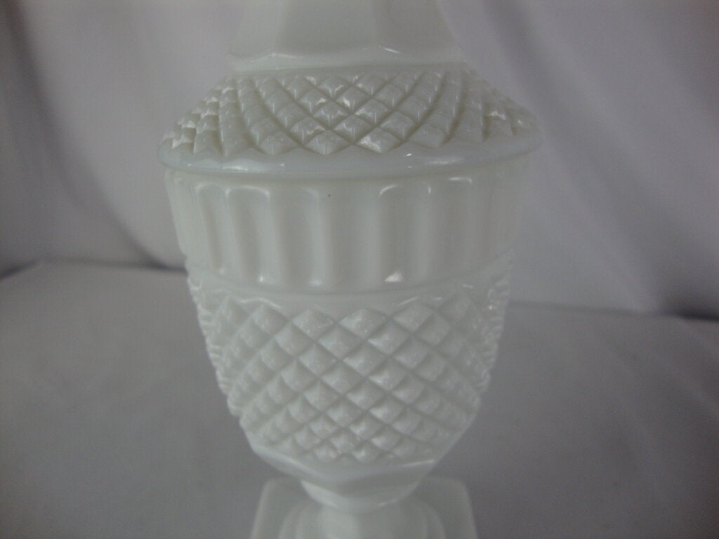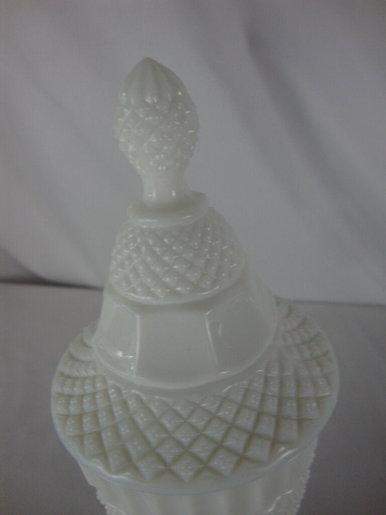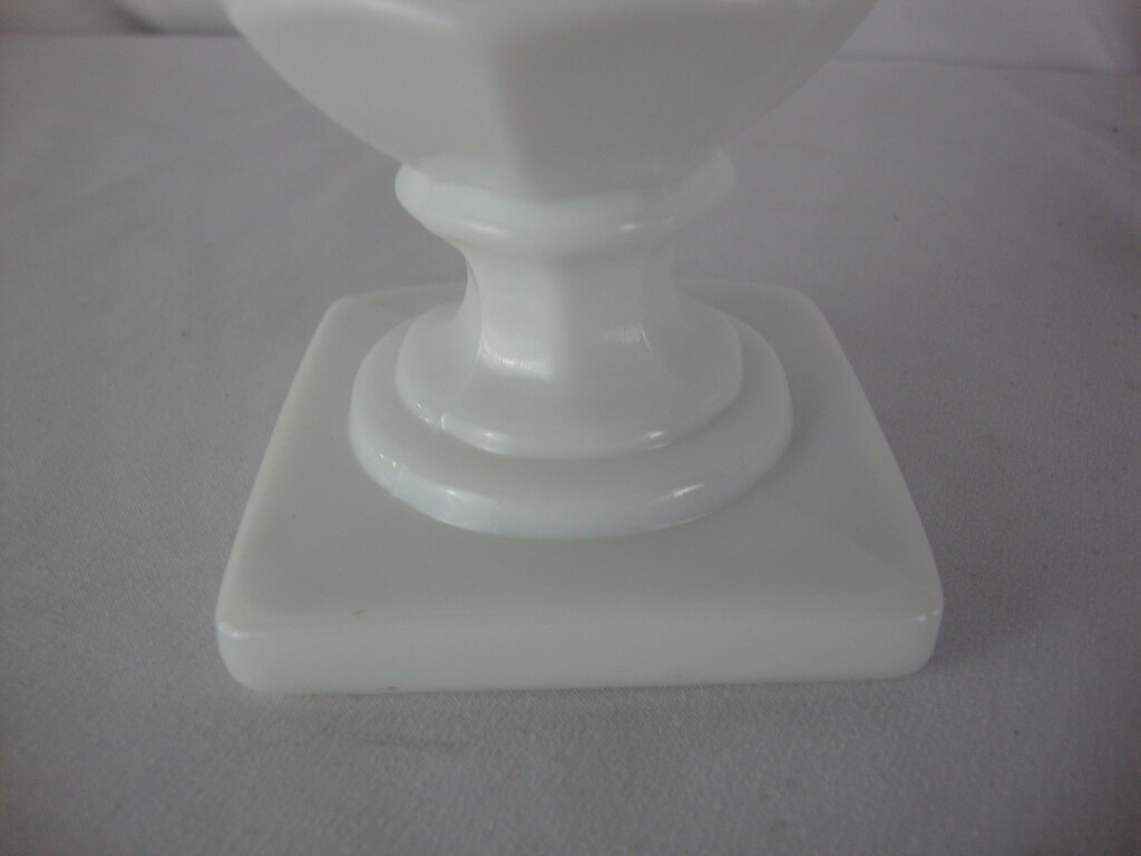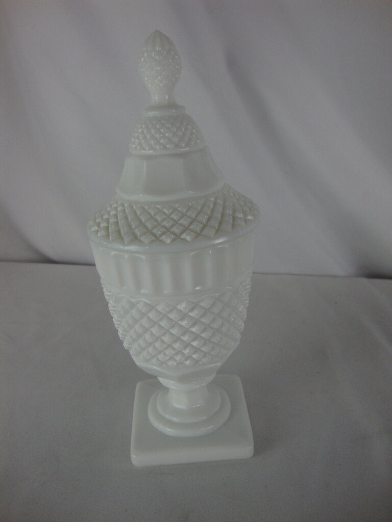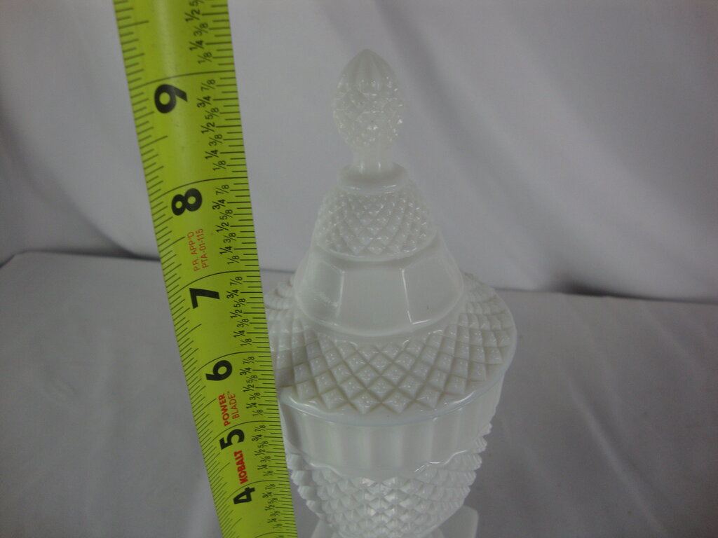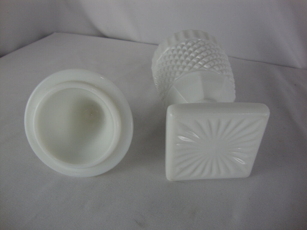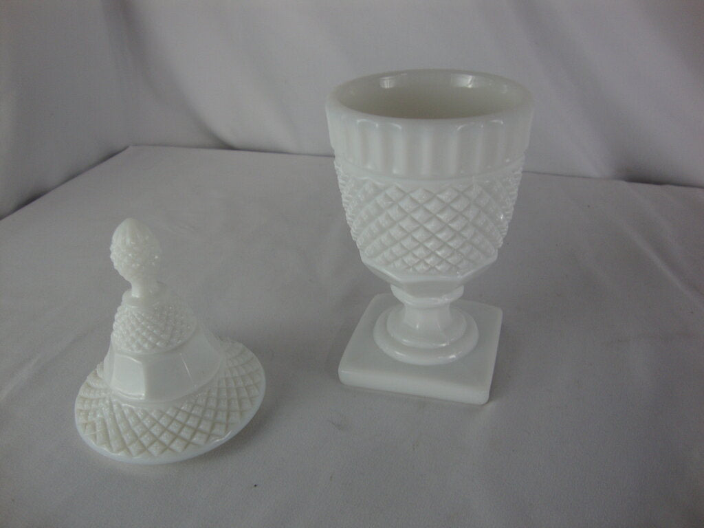 Vintage adorable pedestal candy dish in classic white milk glass with square base with diamond point body with tall diamond point lid with finial top handle. Dish has minimal wear/tear and measures about 5 1/4" body and 8 1/2" finial heights by 2 3/4" square base by 3 1/4" top cup diameter. If you choose to arrange to have an item shipped please make sure to insure the shipment as we are not responsible for damage that occurs in shipping. All items are sold “As Is” and all sales are final. Most pieces are one of a kind and can not be replaced. We will give you as much information as possible regarding the pieces condition including supplying additional pictures if needed. Due to the nature of antique and vintage items there may be blemishes, nicks or other imperfections as expected with age and use. If you want more information about an item, such as additional images or condition, please inquire! All items are located in our store at Standpipe Antiques, 502 O Neal Street, Belton, SC, 29627. Our hours are Wednesday through Saturday 10am to 5pm and Sundays 12-5pm. Come by and see us!