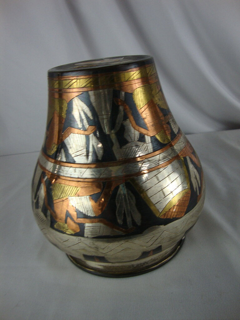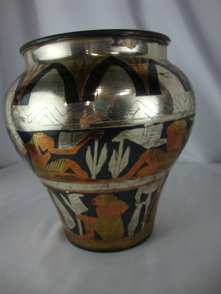 Vintage Egyptian etched metal vase with geometric and Egyptian people on body of vase in shades of black, silver, brass. Vase has minimal wear/tear, flaws and measures about 7" height by 3 1/2" bottom diameter. If you choose to arrange to have an item shipped please make sure to insure the shipment as we are not responsible for damage that occurs in shipping. All items are sold “As Is” and all sales are final. Most pieces are one of a kind and can not be replaced. We will give you as much information as possible regarding the pieces condition including supplying additional pictures if needed. Due to the nature of antique and vintage items there may be blemishes, nicks or other imperfections as expected with age and use. If you want more information about an item, such as additional images or condition, please inquire! All items are located in our store at Standpipe Antiques, 502 O Neal Street, Belton, SC, 29627. Our hours are Wednesday through Saturday 10am to 5pm and Sundays 12-5pm. Come by and see us!